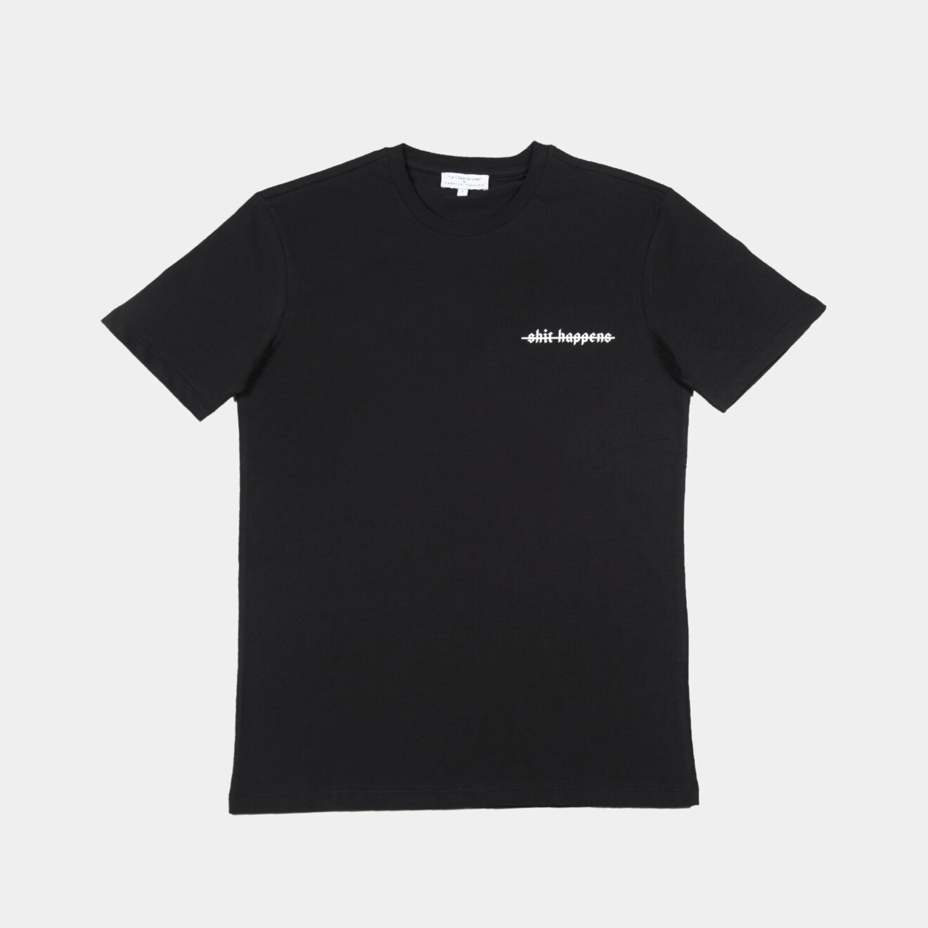 100% high-quality cotton crew neck t-shirt printed with a strike-through “s#%$ happens” on the front. Back of t-shirt striped with