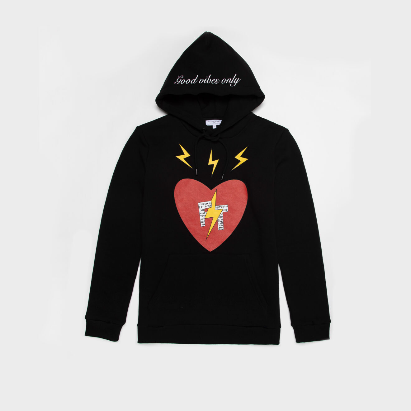 100% high-quality cotton black sweater with “Good vibes only” printed in white around the front collar. FT red hearts &