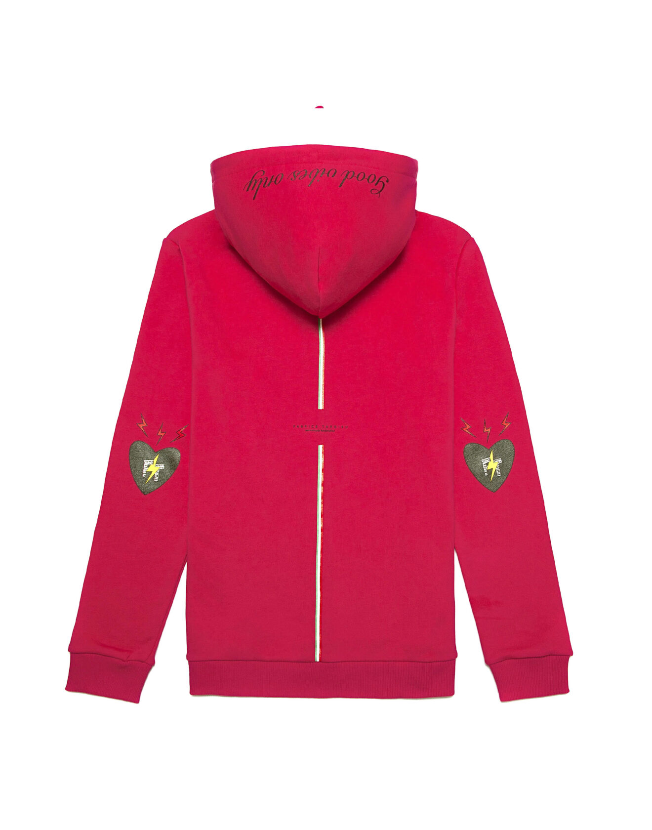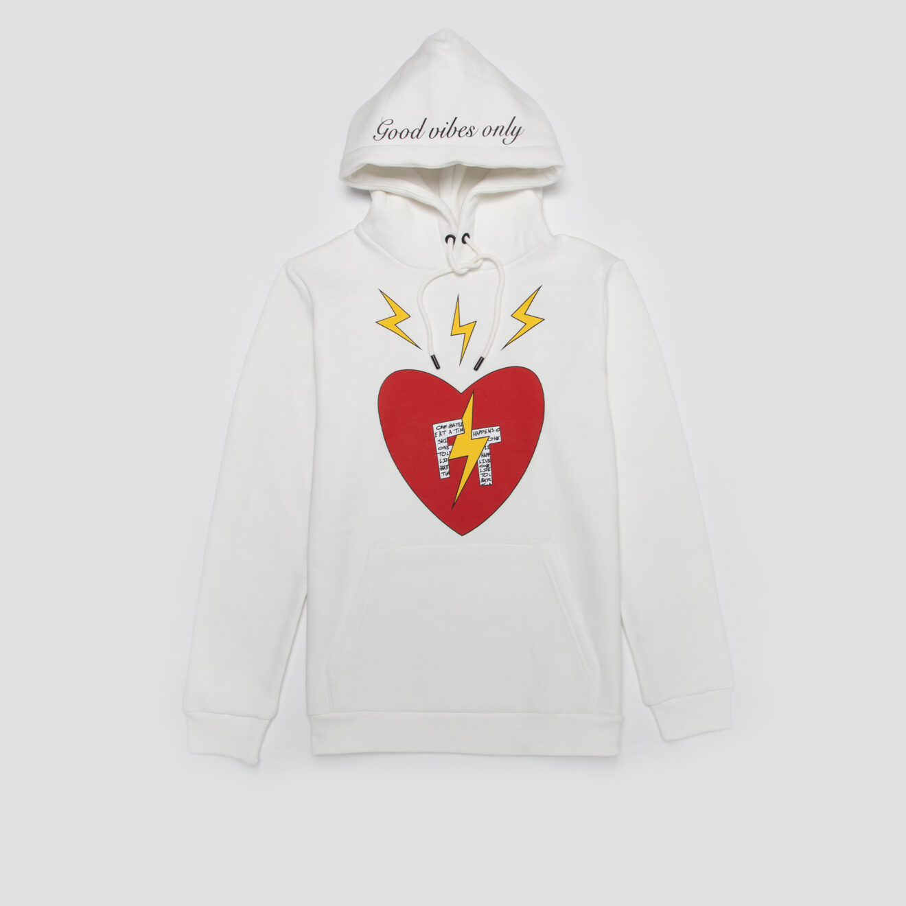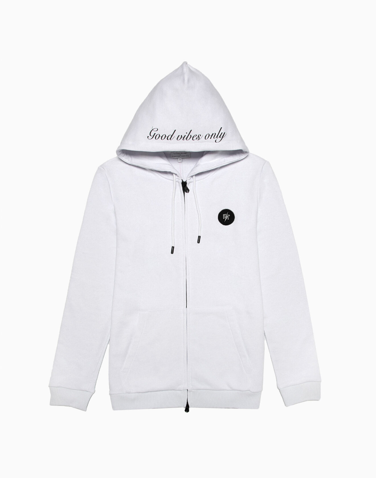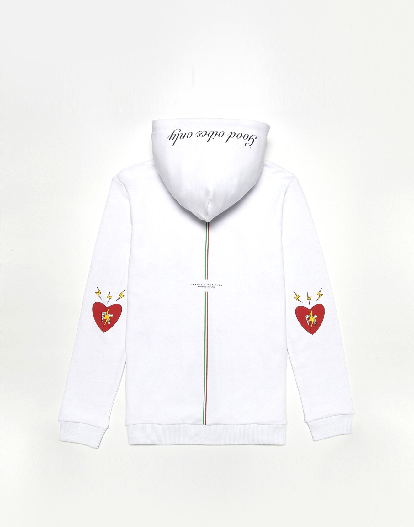 100% high-quality cotton white hoodie designed with FT red heart and signature lightning bolts on the front. FT initials encompass