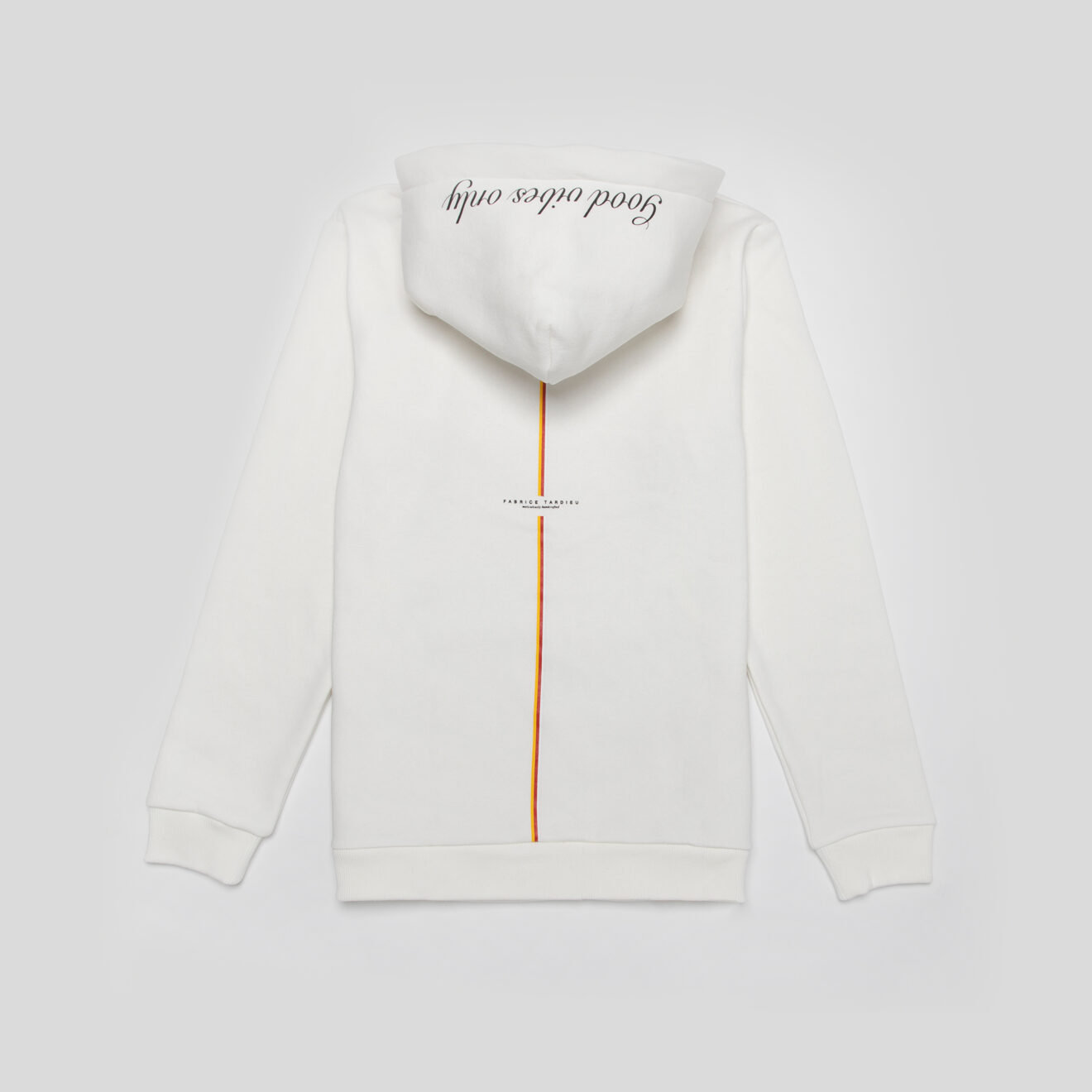 White short-sleeve crew tee with purple “Good Vibes Only…” on left shoulder. 100% Cotton. Fabrice Tardieu stripe centered on the