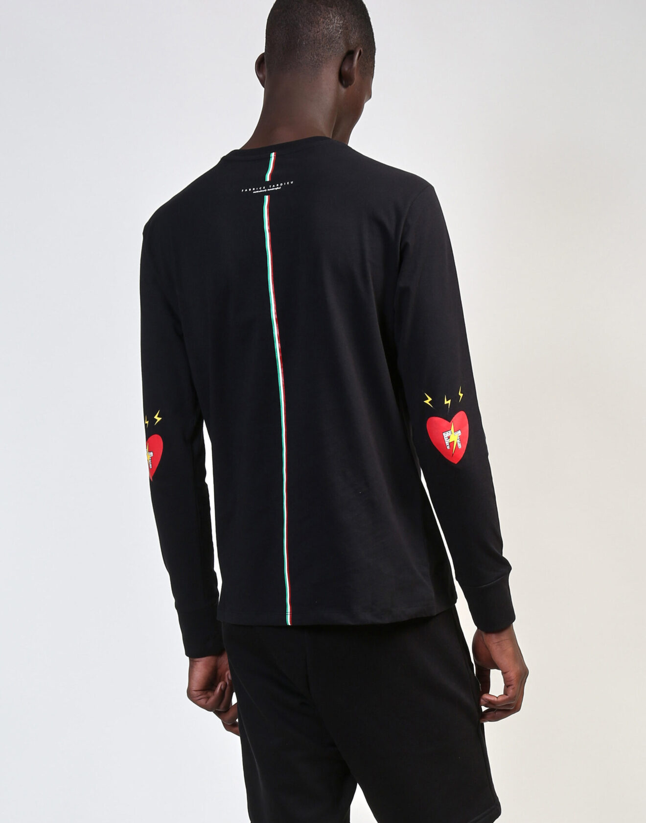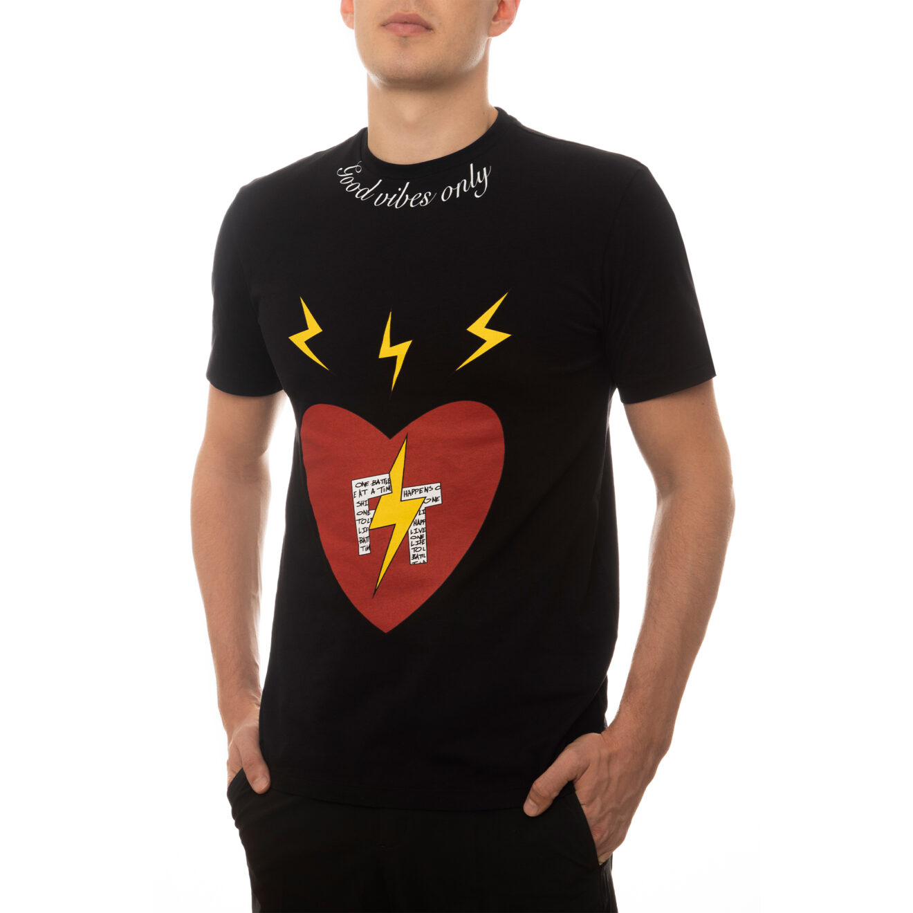 100% high-quality cotton black crew neck t-shirt designed with FT red heart and signature lightning bolts on the front. FT