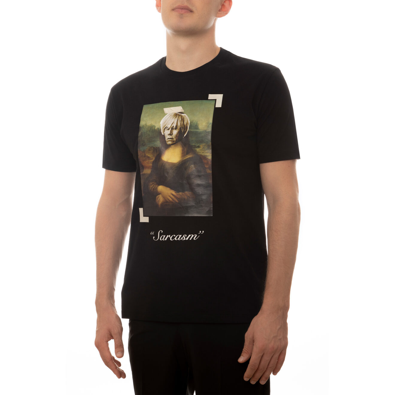 100% high-quality cotton crew neck black t-shirt printed with Andy Warhol’s head on top of Mona Lisa and the word