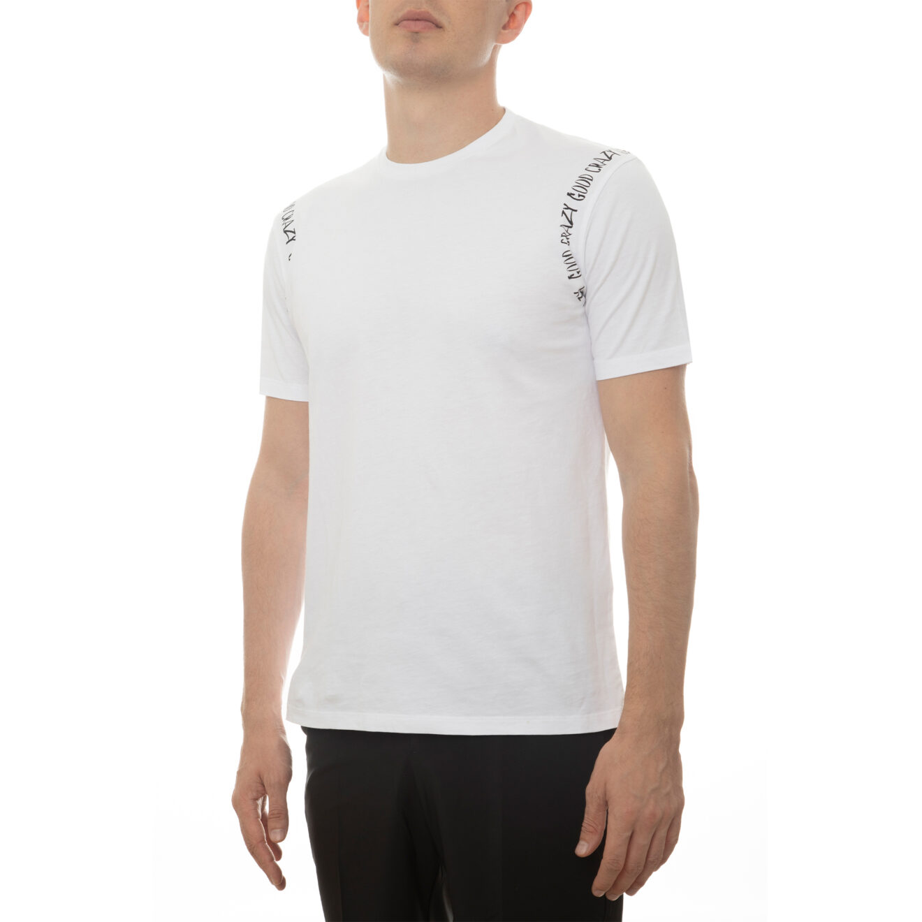 100% high-quality cotton crew neck white t-shirt designed with “GOOD CRAZY” around the full arm sleeve. Printed with Fabrice Tardieu’s