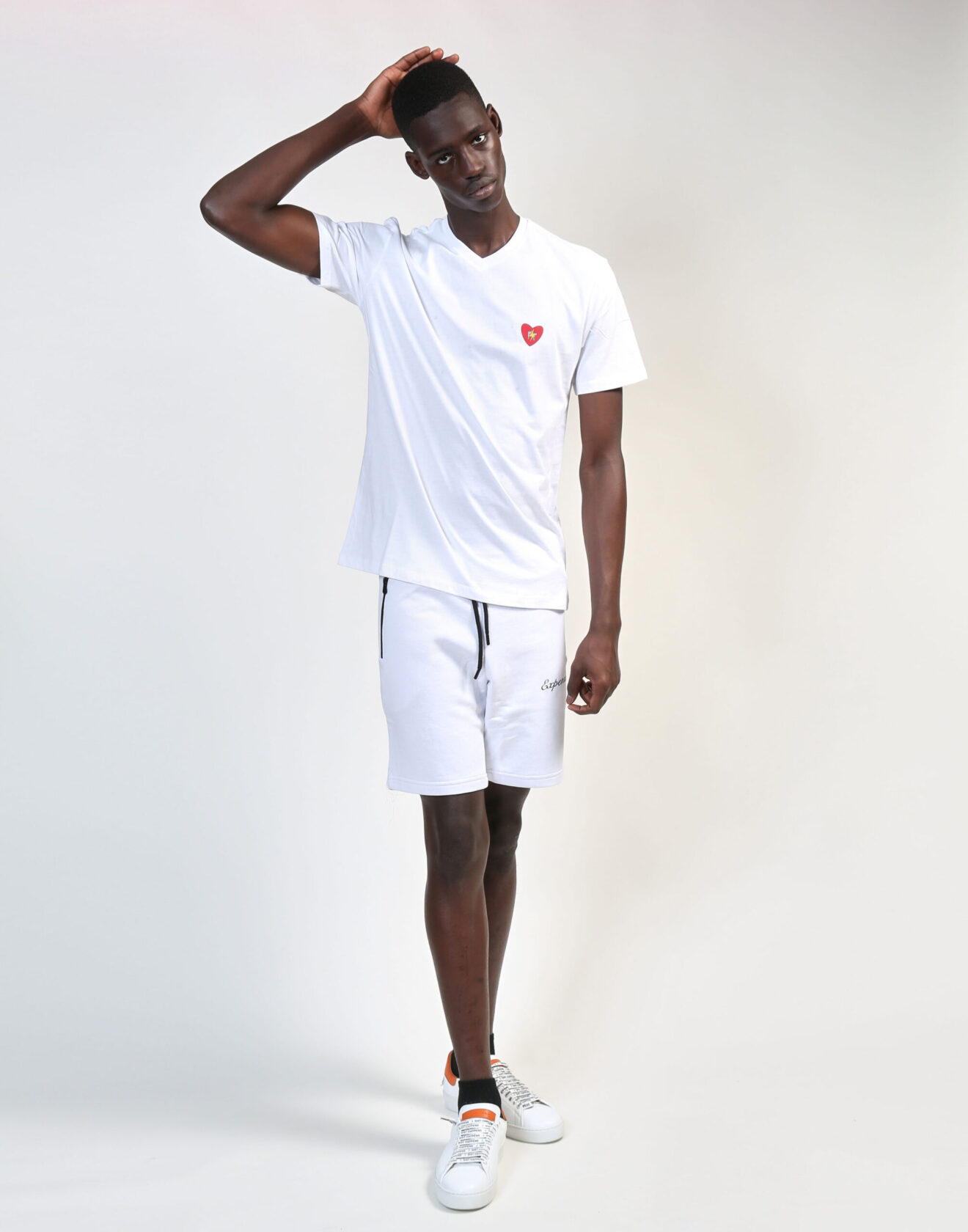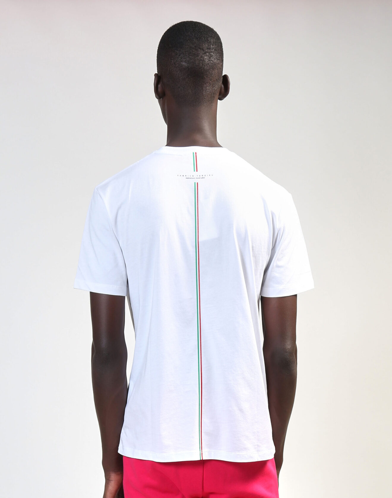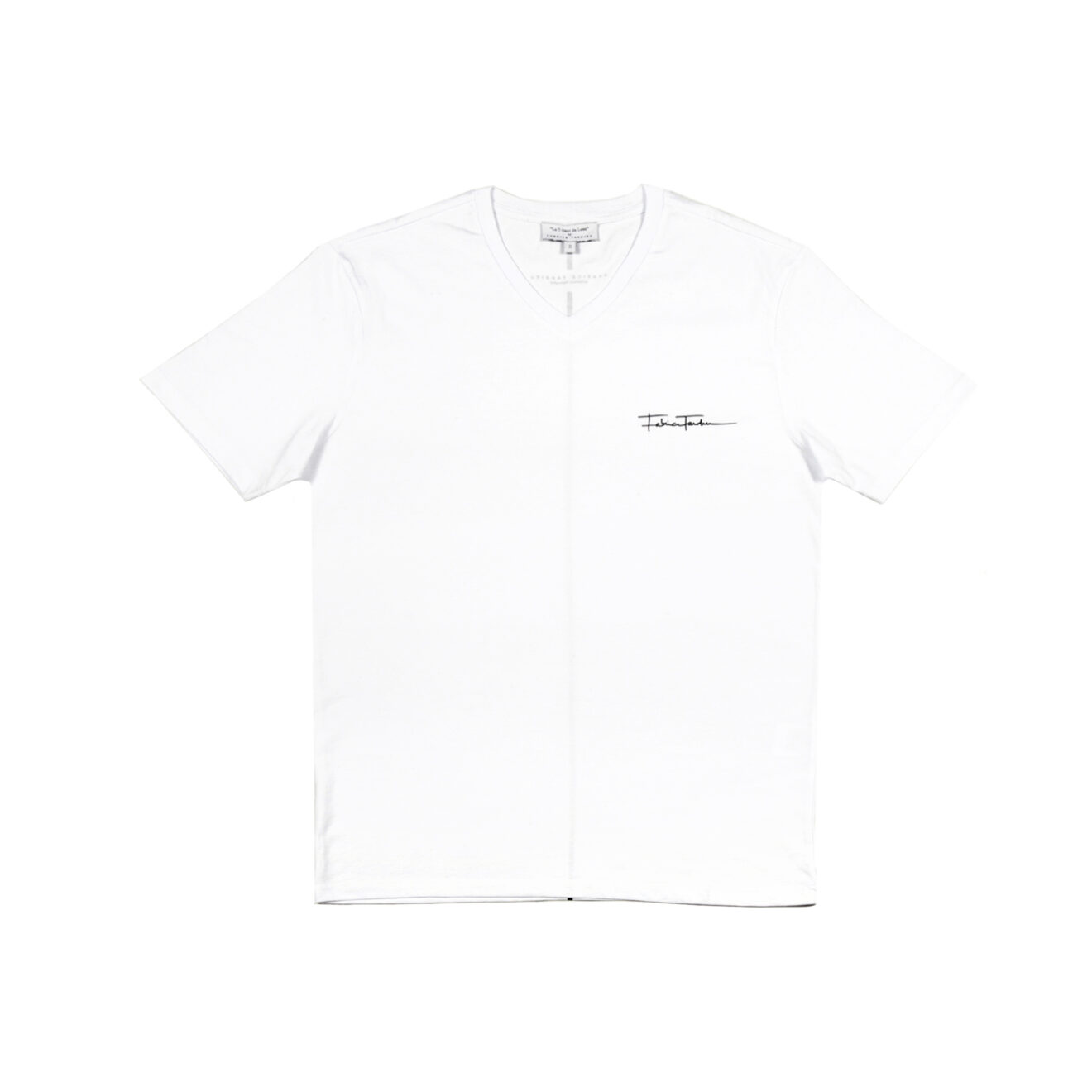 100% high-quality cotton V neck white t-shirt designed with Fabrice Tardieu initials inside a small red heart and yellow lightning