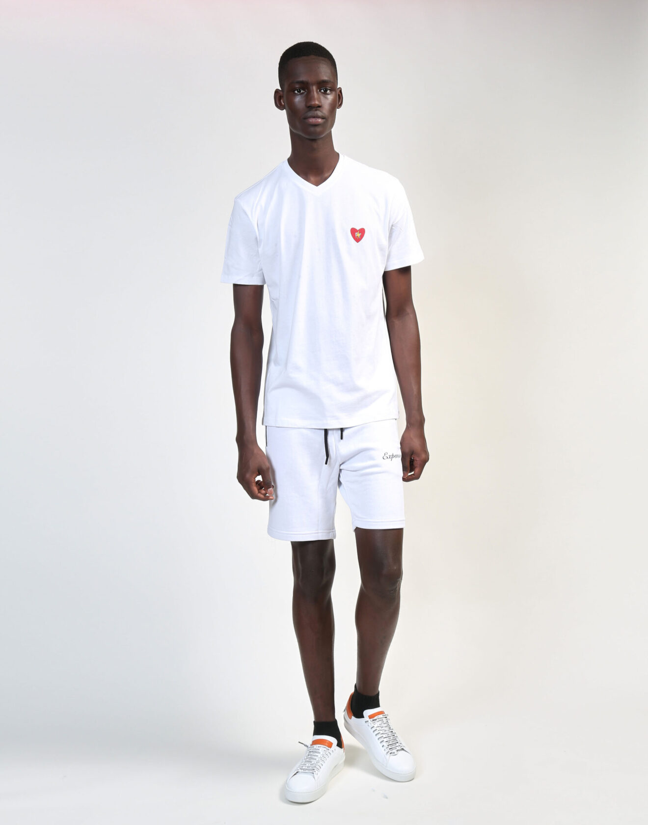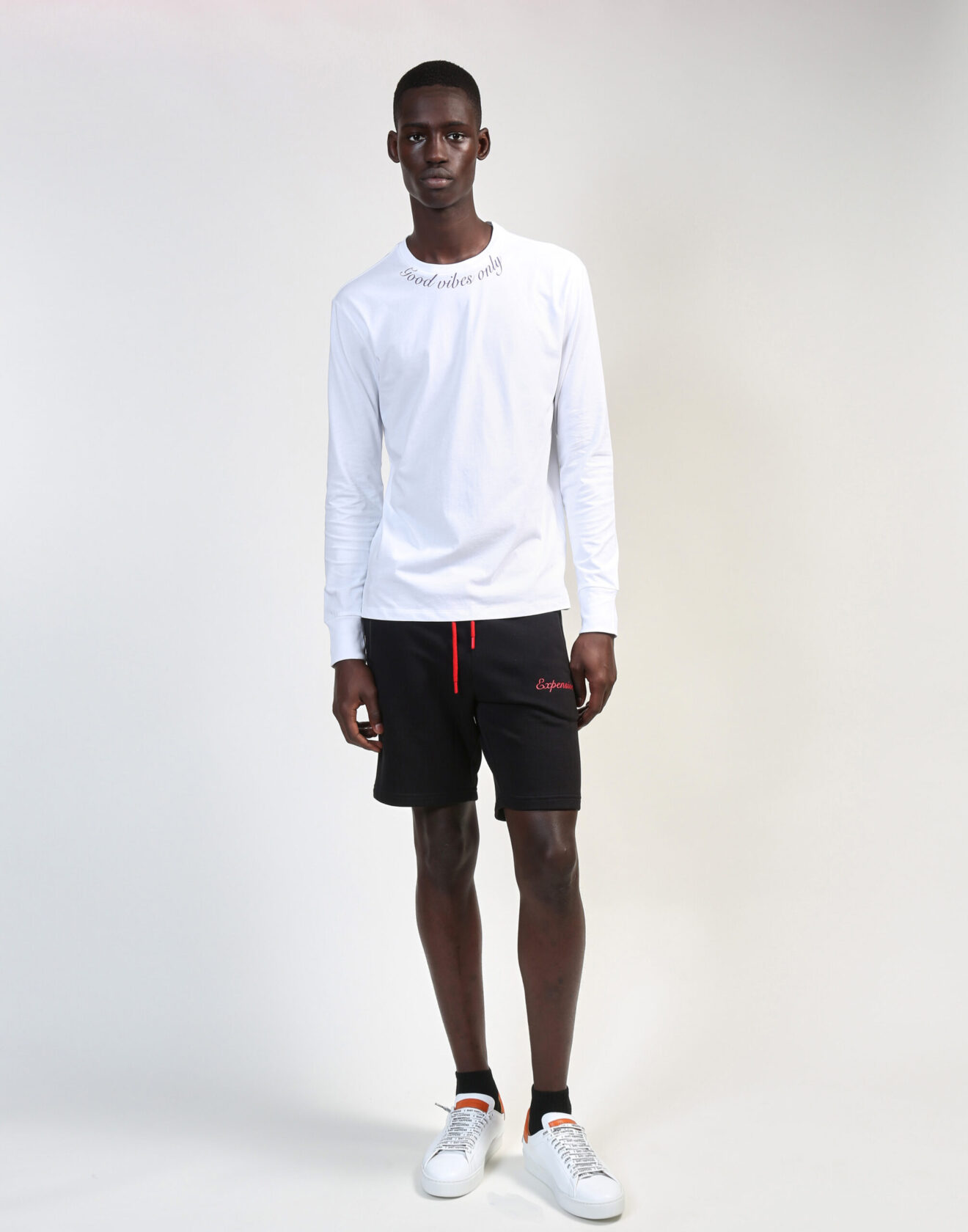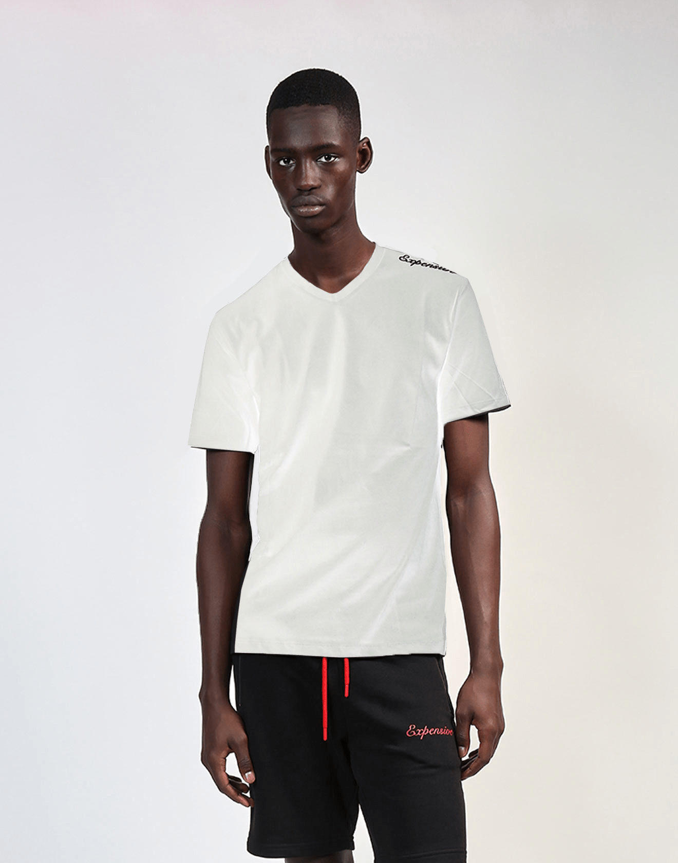 White above-the-knee shorts. 100% Cotton. Black zipper pockets, black waist drawstring, and black “Expensive” over left pocket.