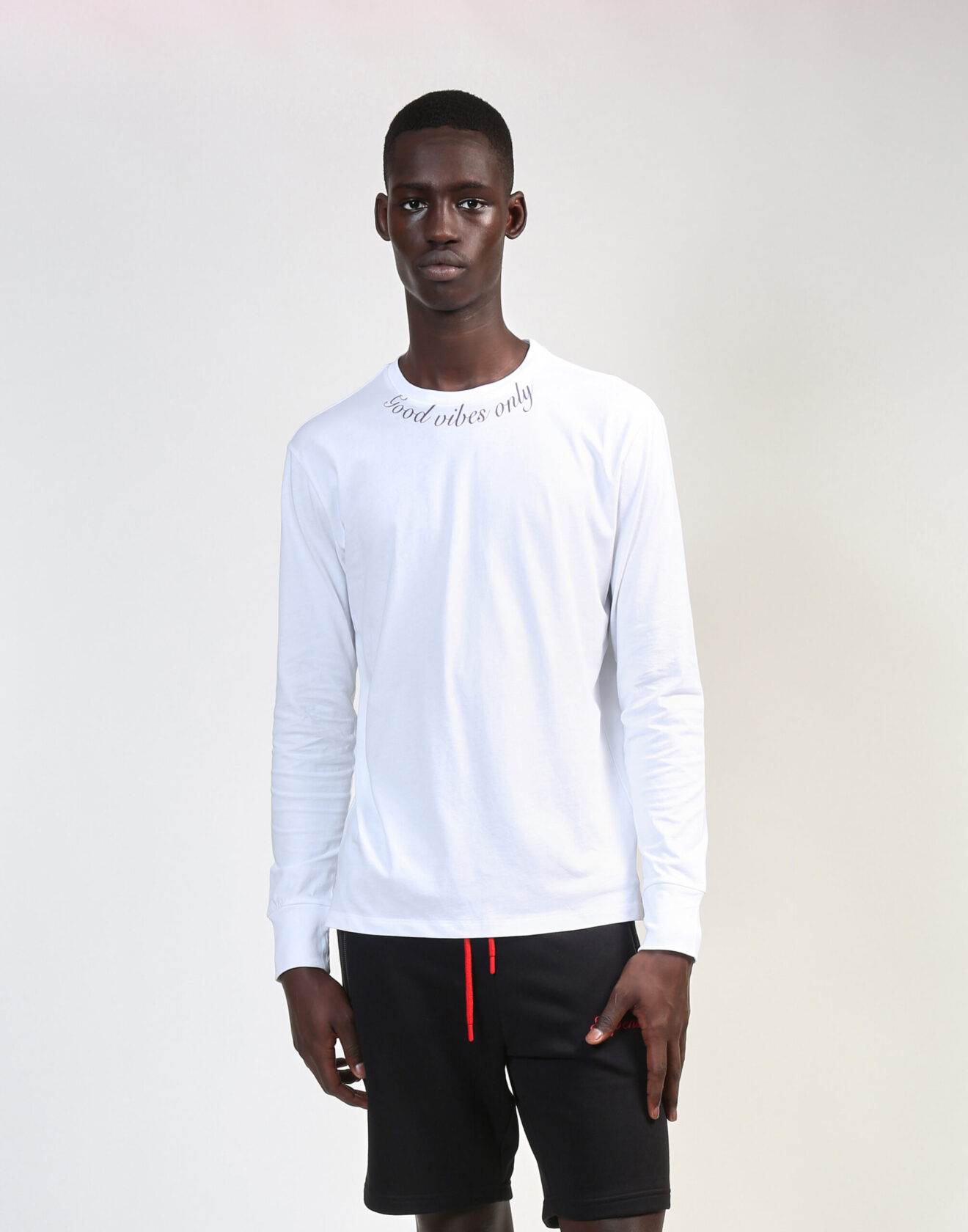 100% high-quality cotton crew neck white t-shirt printed with “Good vibes only” in red ink around the front collar. Fabrice