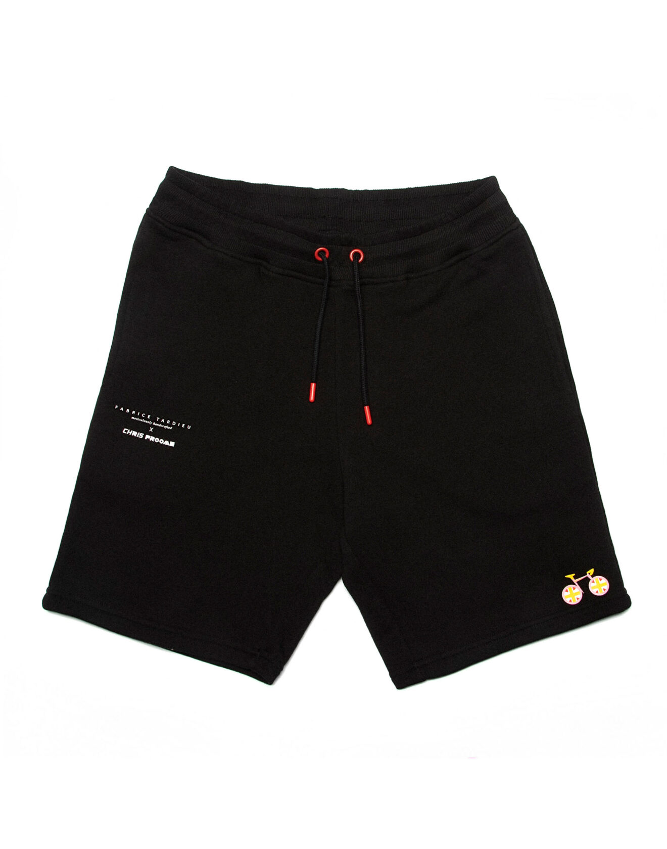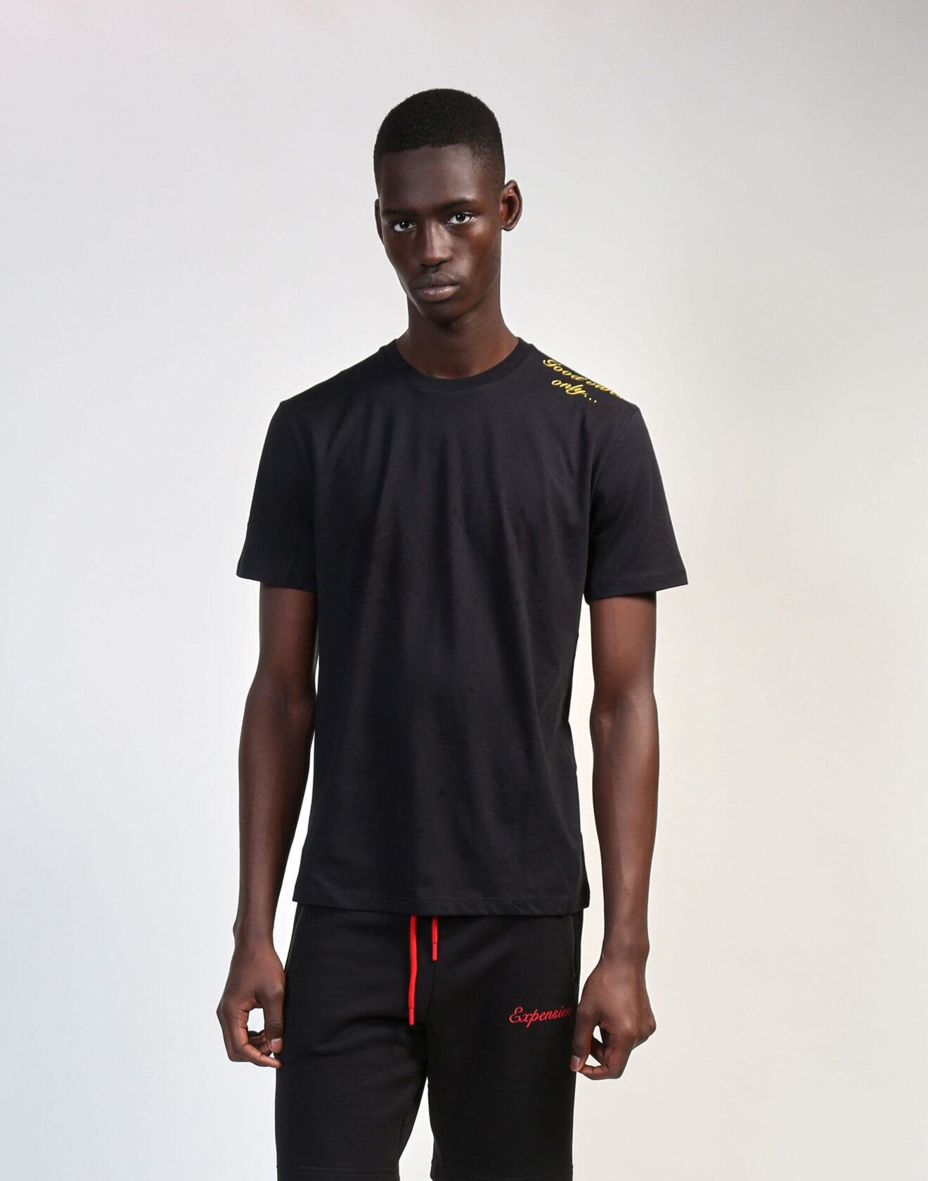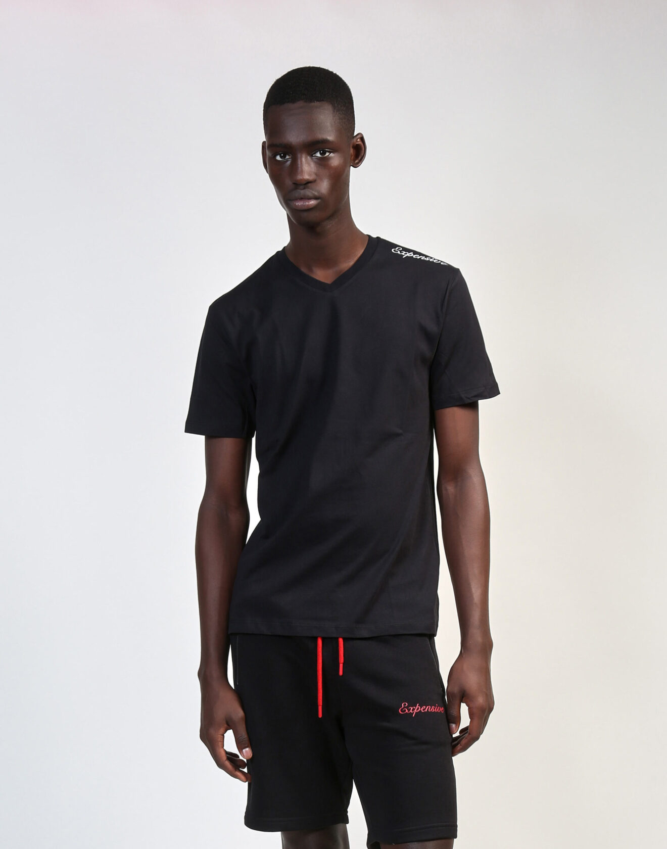 Black above-the-knee shorts. 100% Cotton. Black zipper pockets, red waist drawstring, and red “Expensive” over left pocket.