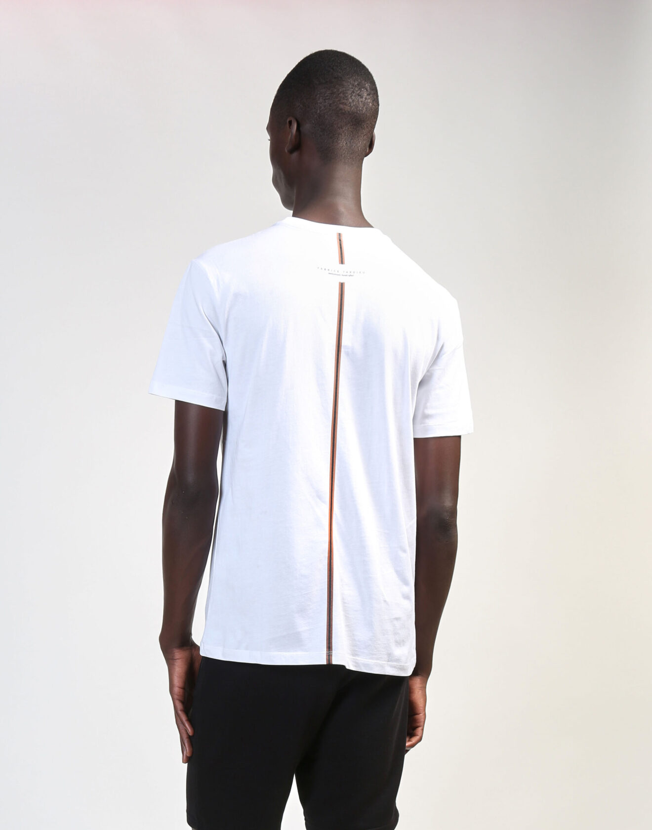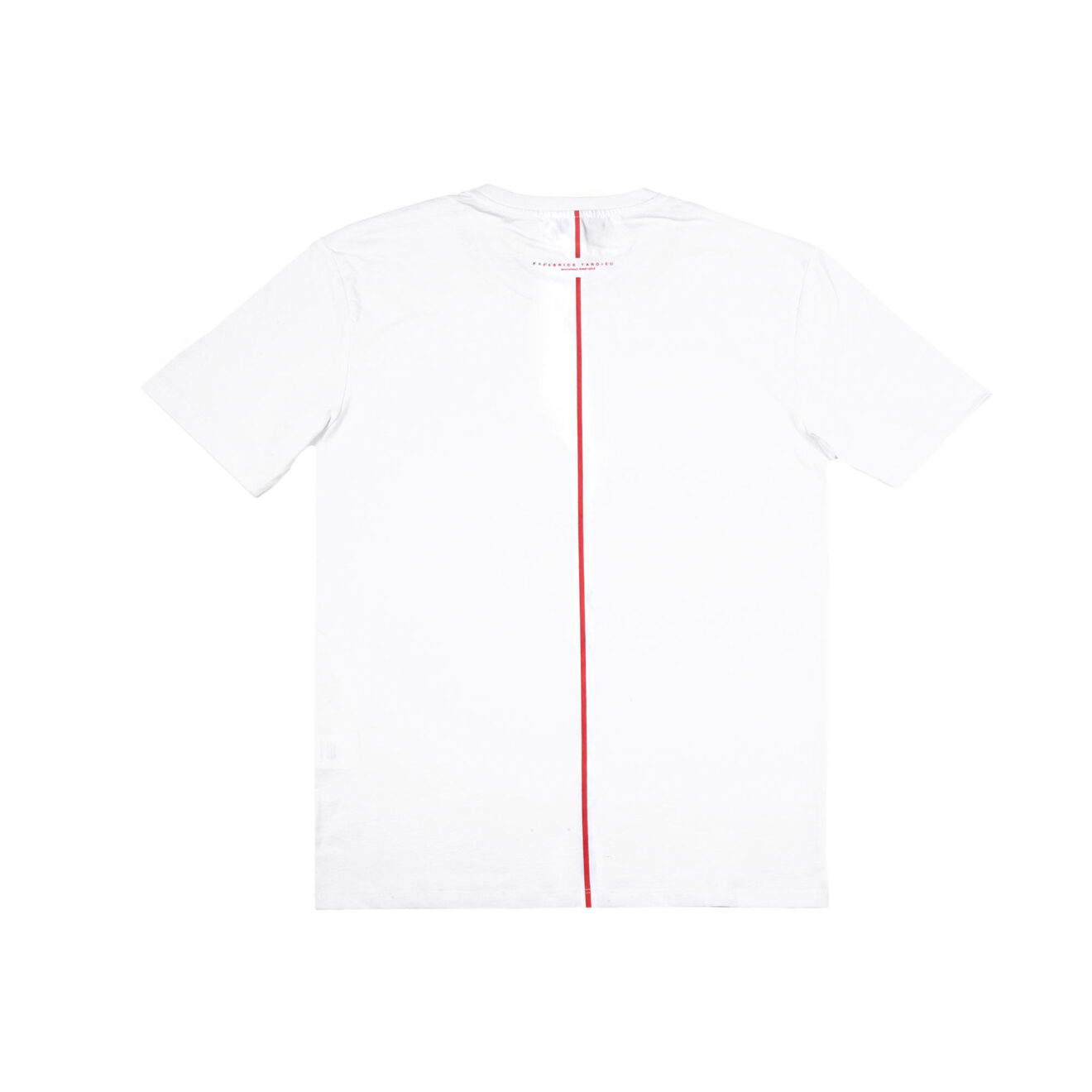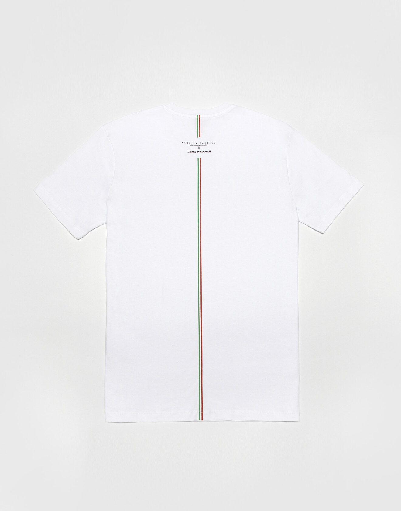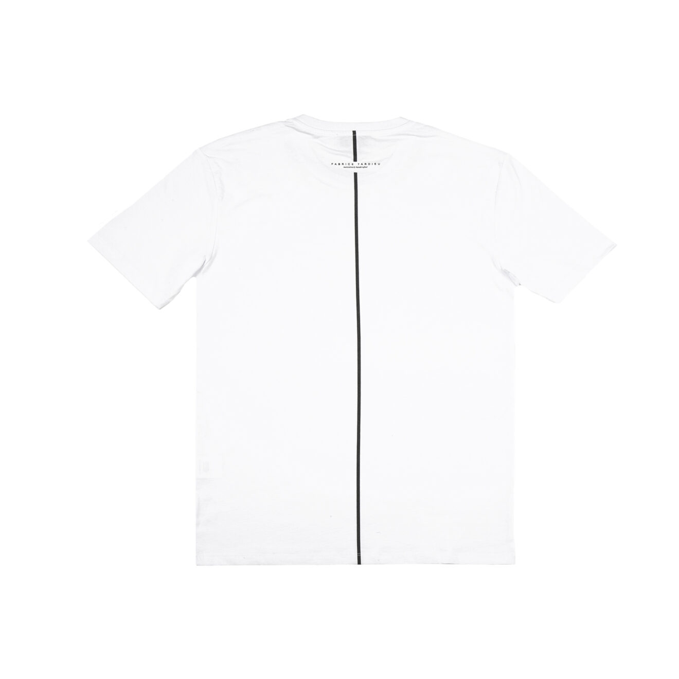 White short-sleeve crew tee with “Expensive Human” around collar. 100% Cotton. Fabrice Tardieu stripe centered on the back.