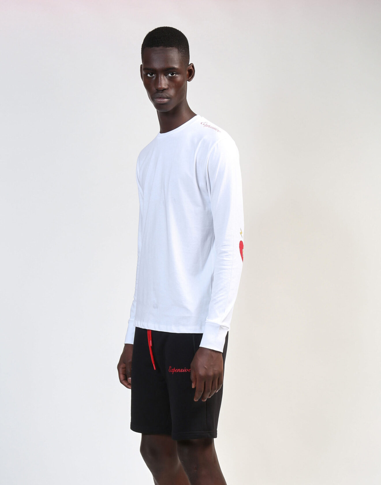 White long-sleeve crew tee with “Expensive” written on left shoulder. 100% Cotton. Embellished signature heart & lightning bolts on the
