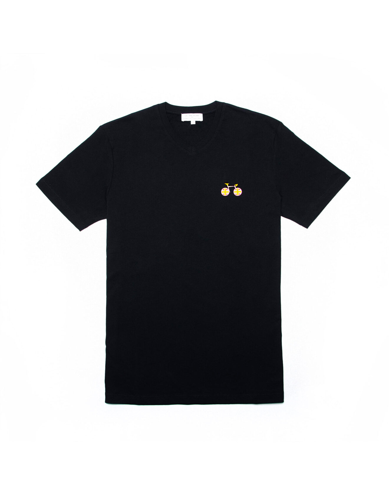 Black short-sleeve crew tee with yellow “Good Vibes Only…” on left shoulder. 100% Cotton. Fabrice Tardieu stripe centered on the