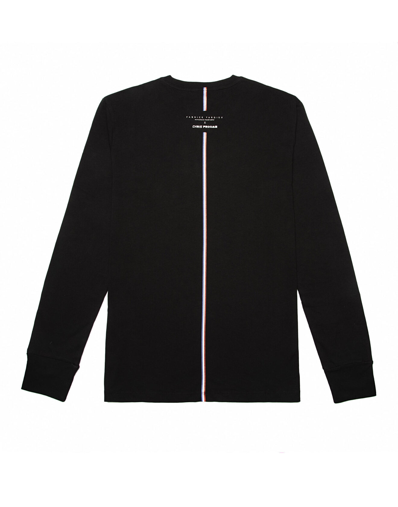 Black short-sleeve crew tee with “Expensive Human” around collar. 100% Cotton. Fabrice Tardieu stripe centered on the back.