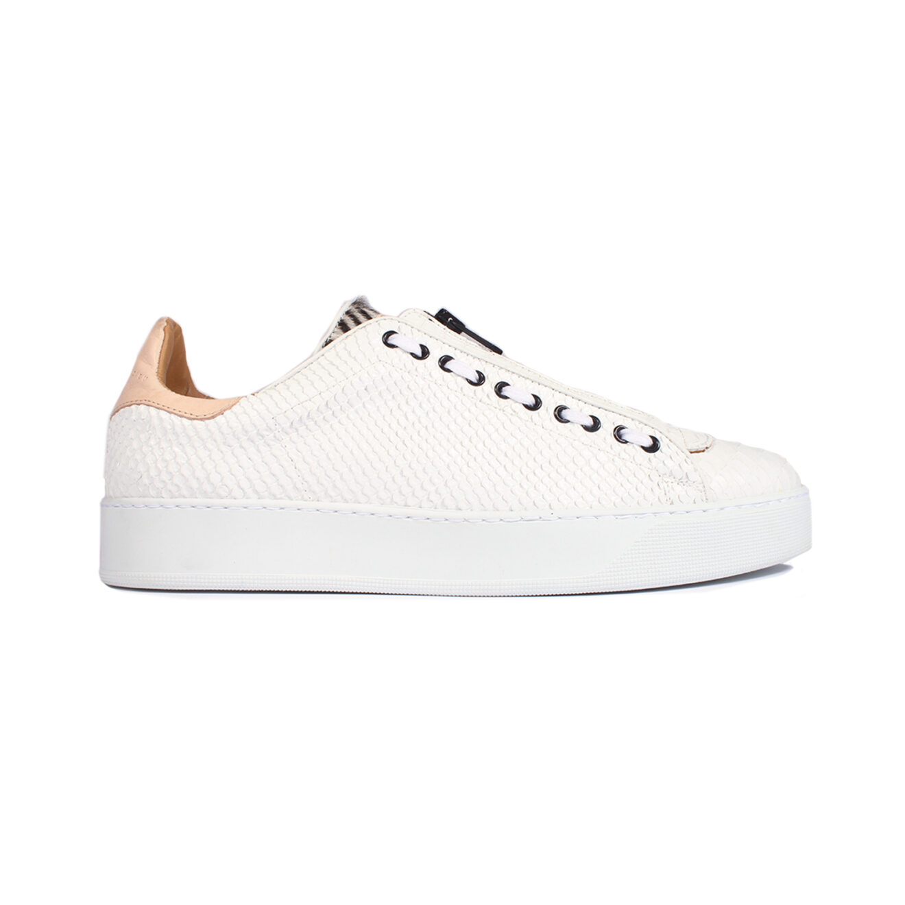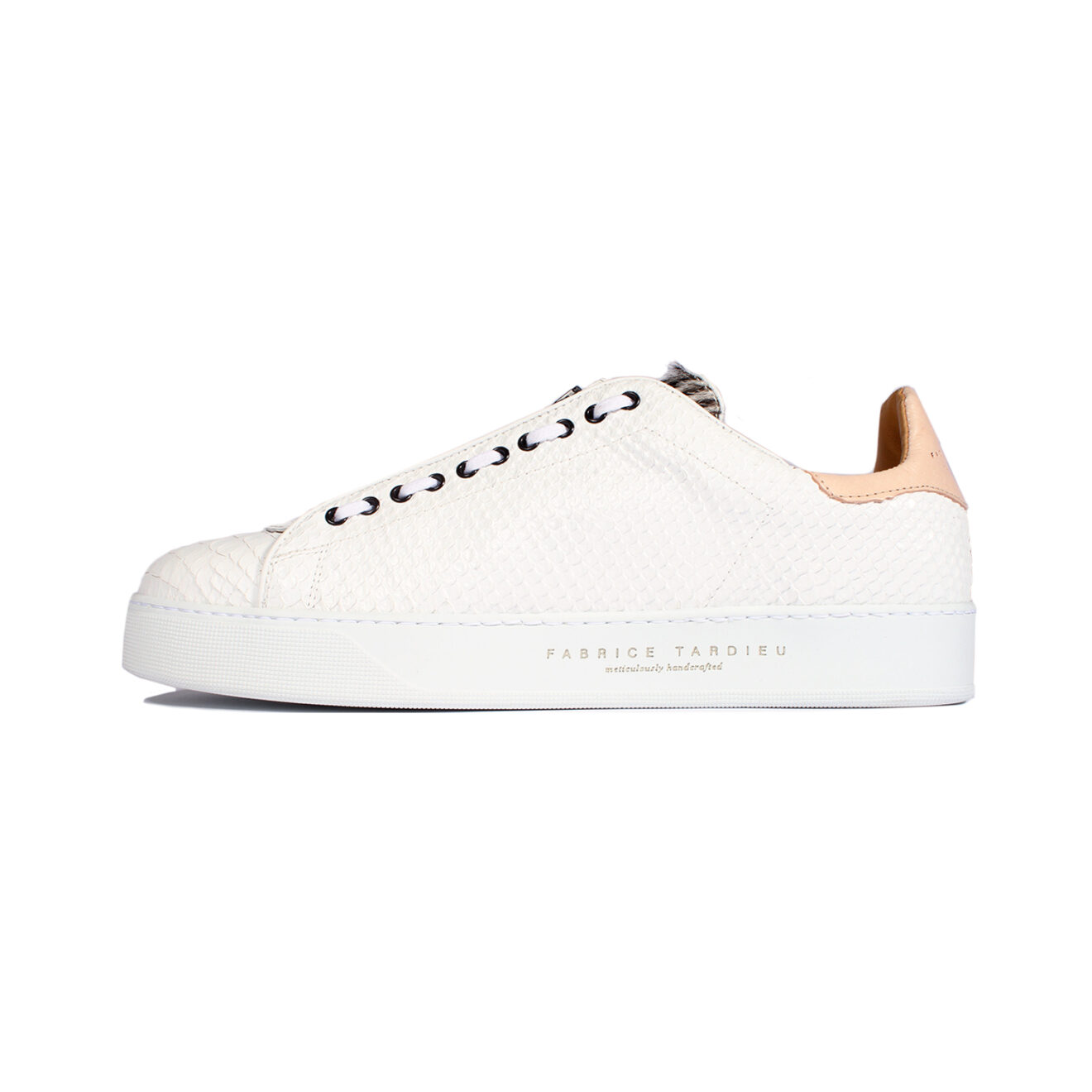 Men’s low-top white leather sneakers with python details on the heel and toe cap. Comes with “Sh%# Happens” laces.
