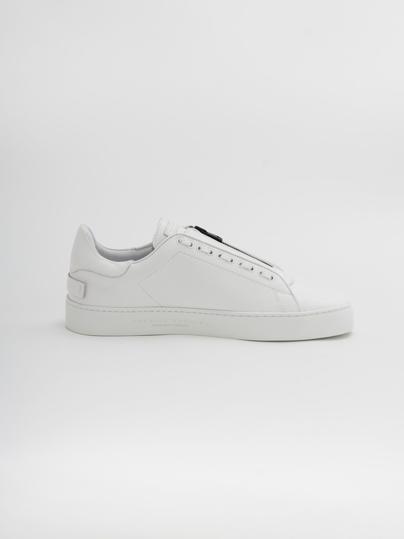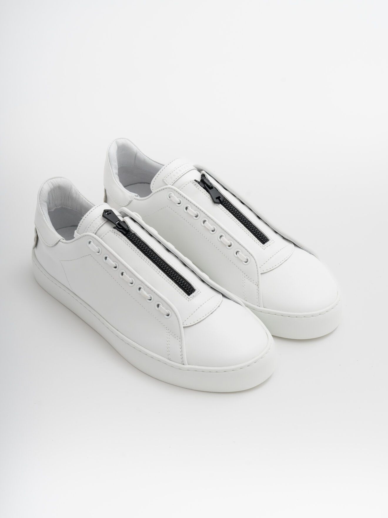 Men’s low-top, slip-on dress sneaker designed for a laid-back luxury vibe. Ehite leather on a white Margom sole and stylishly