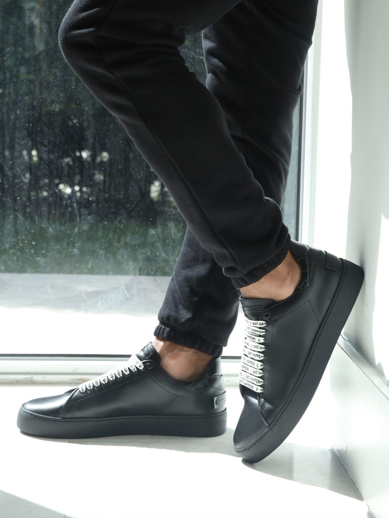 The men’s “Tristan” Black and Black low-top sneaker embodies a classic + laid-back luxury style. Made with 100% Italian leather