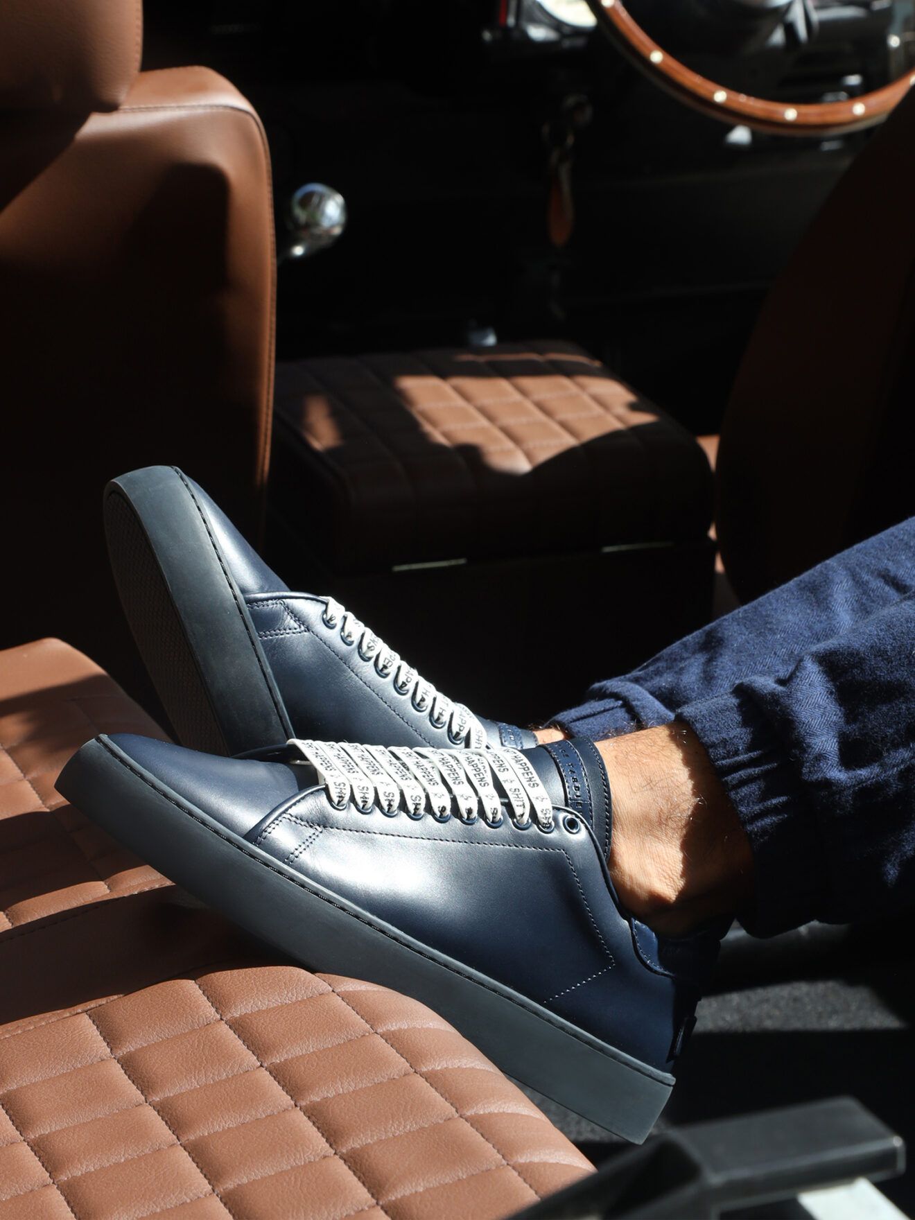 The men’s “Tristan” Navy and Navy low-top sneaker embodies a classic + laid-back luxury style. Made with 100% Italian leather