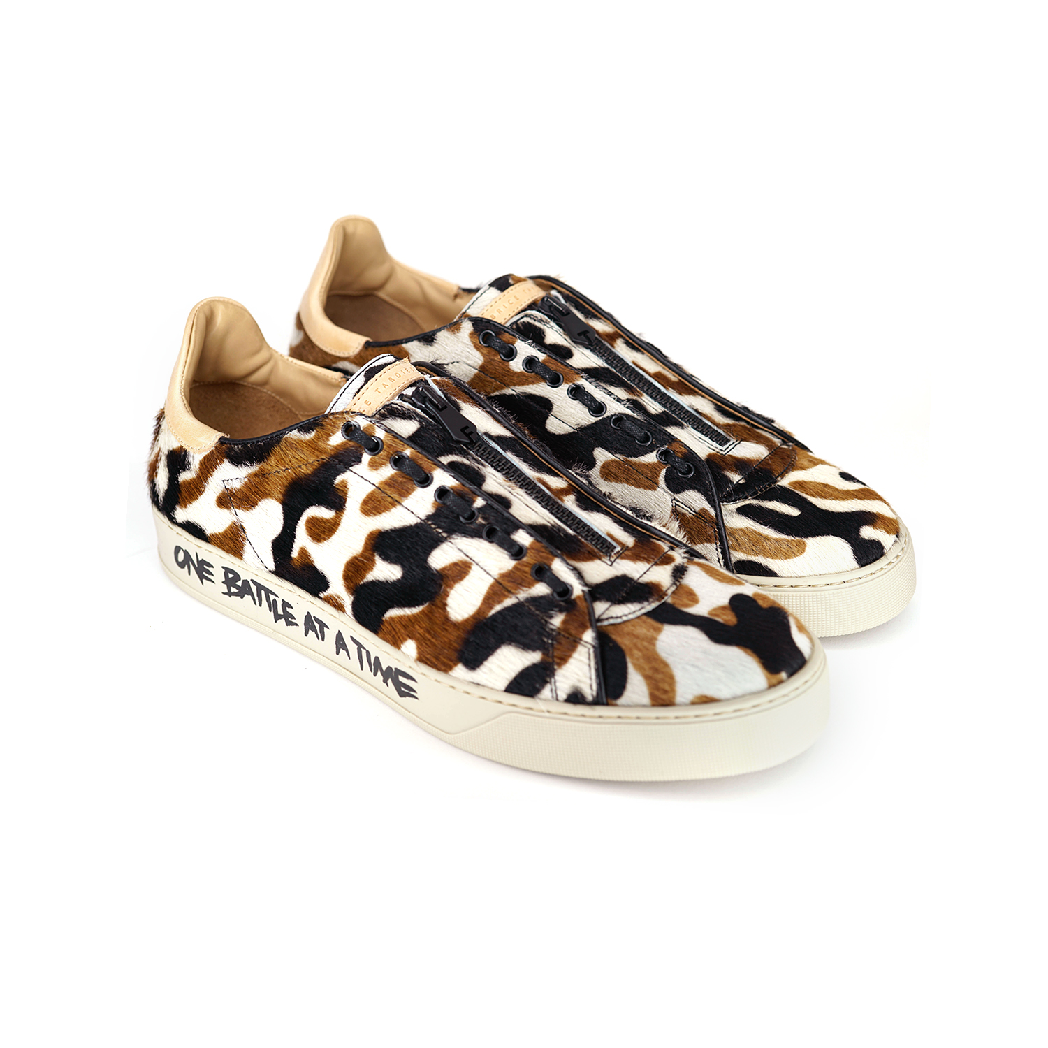The Men’s Garry dress sneaker is a stylish slip-on sneaker embellished with sand camo print pony hair. The supple white rubber soles are handwritten in black acrylic leather paint (graffiti-style) that read Fabrice’s signature “ONE DAY AT A TIME” and “ONE BATTLE AT A TIME”. Finished with black waxed laces, black zipper detail and beige leather heel tab.