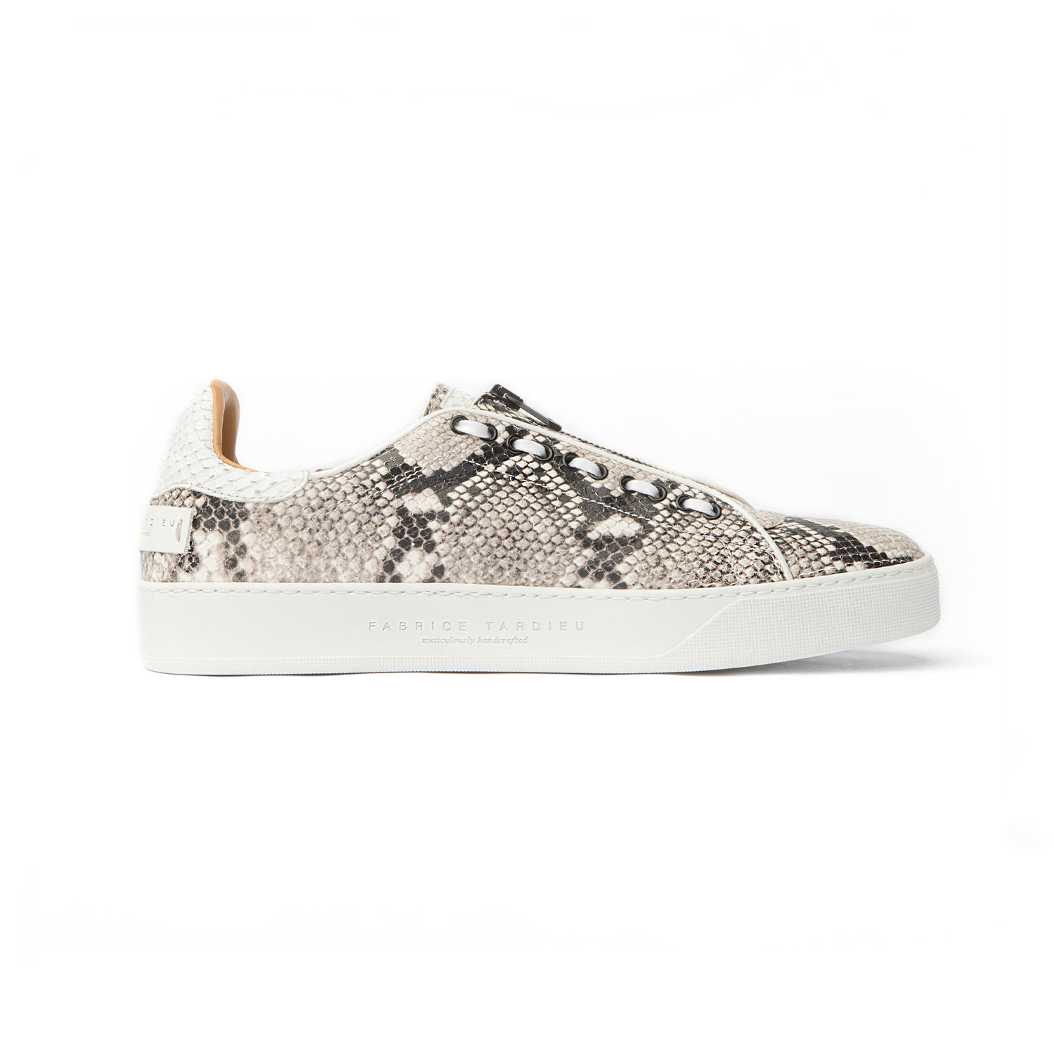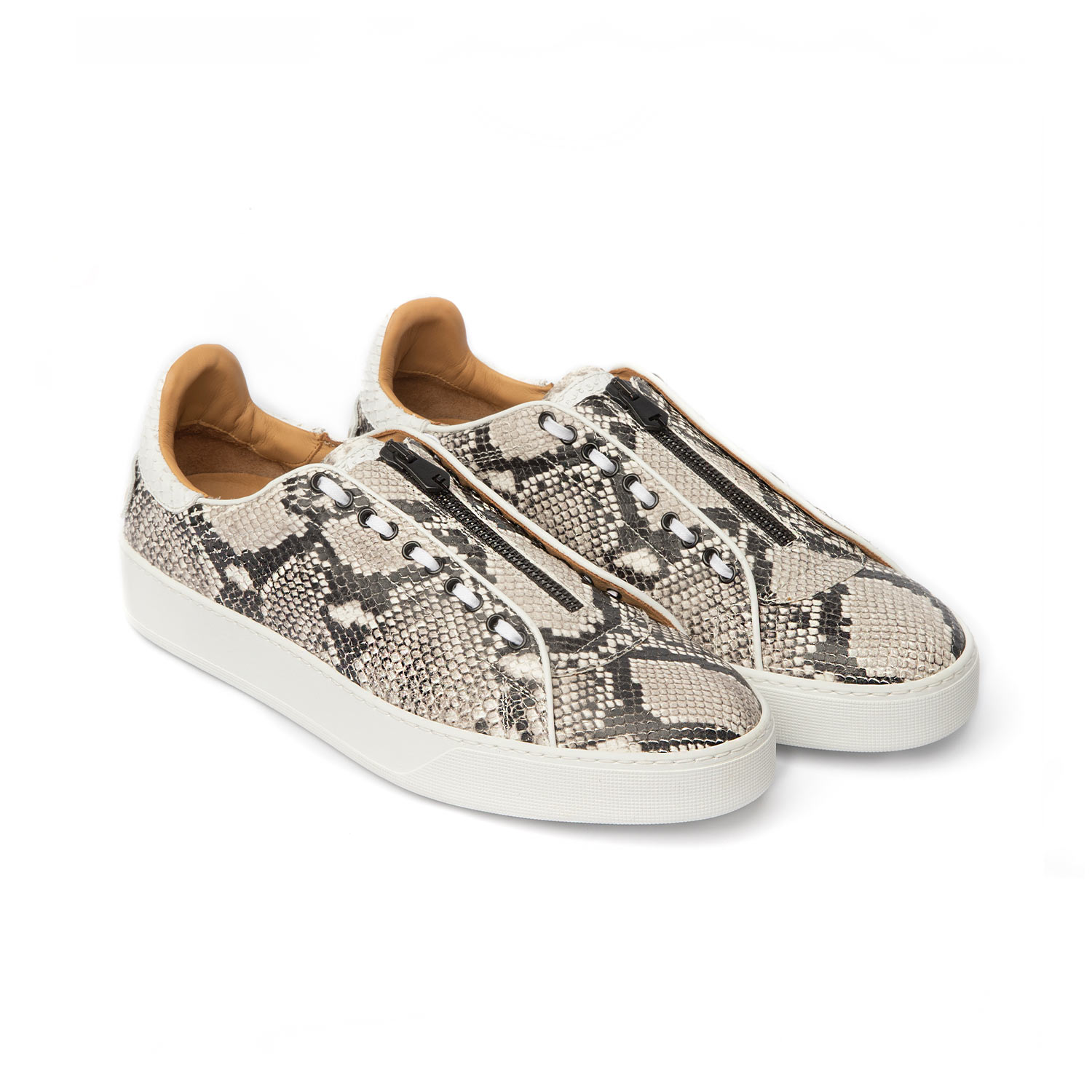 Men’s low-top, slip-on dress sneaker designed for a laid-back luxury vibe. Grey python-inspired print on a white Margom sole and stylishly finished with white laces along the eyelet and black zipper detail on the tongue.
