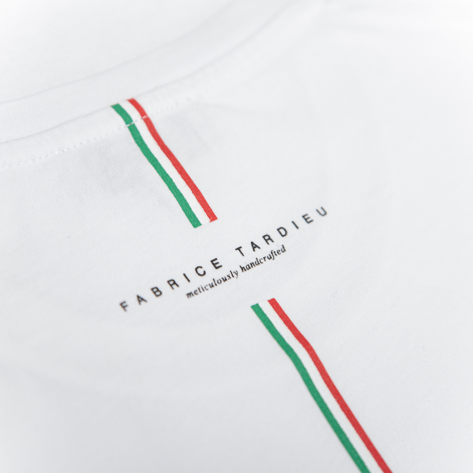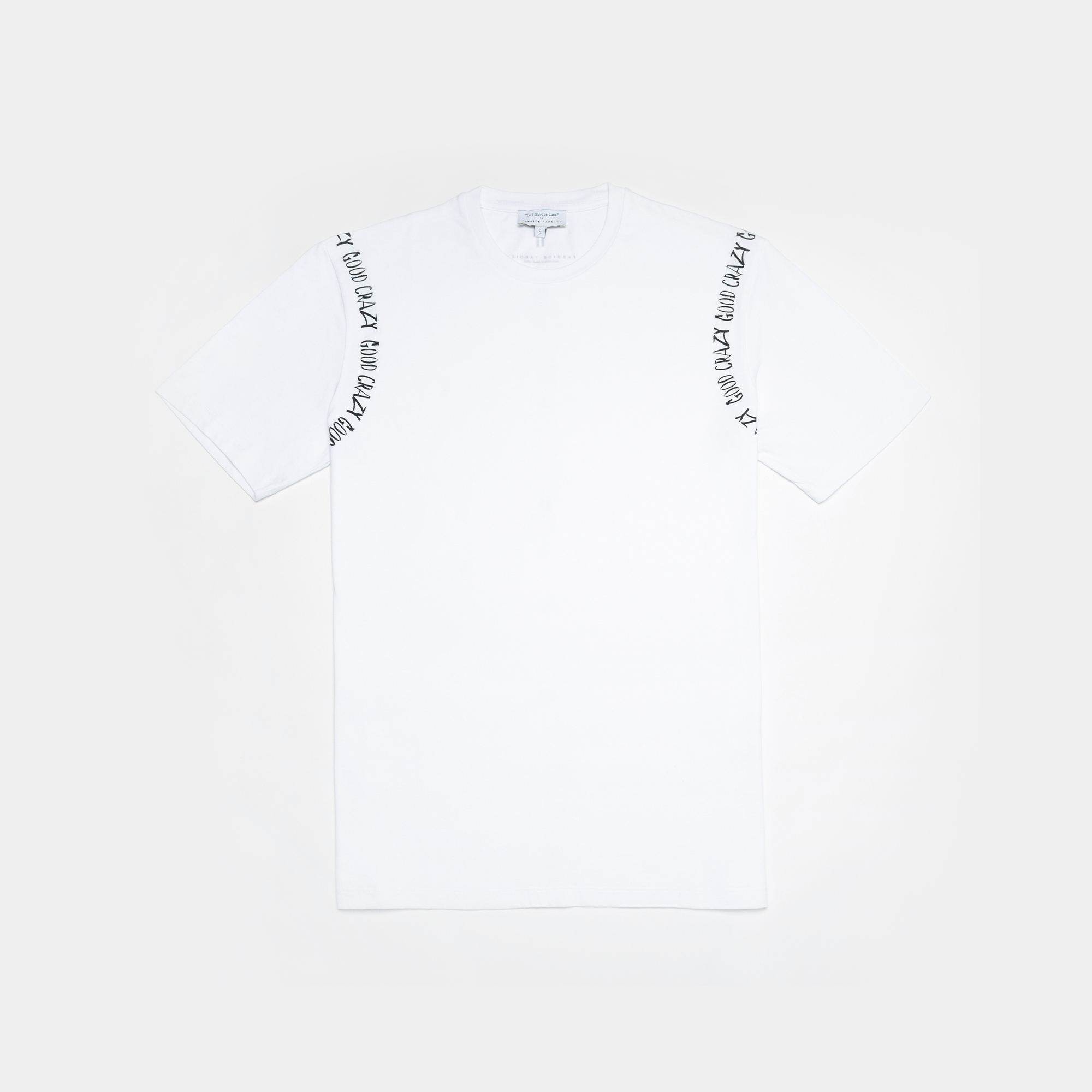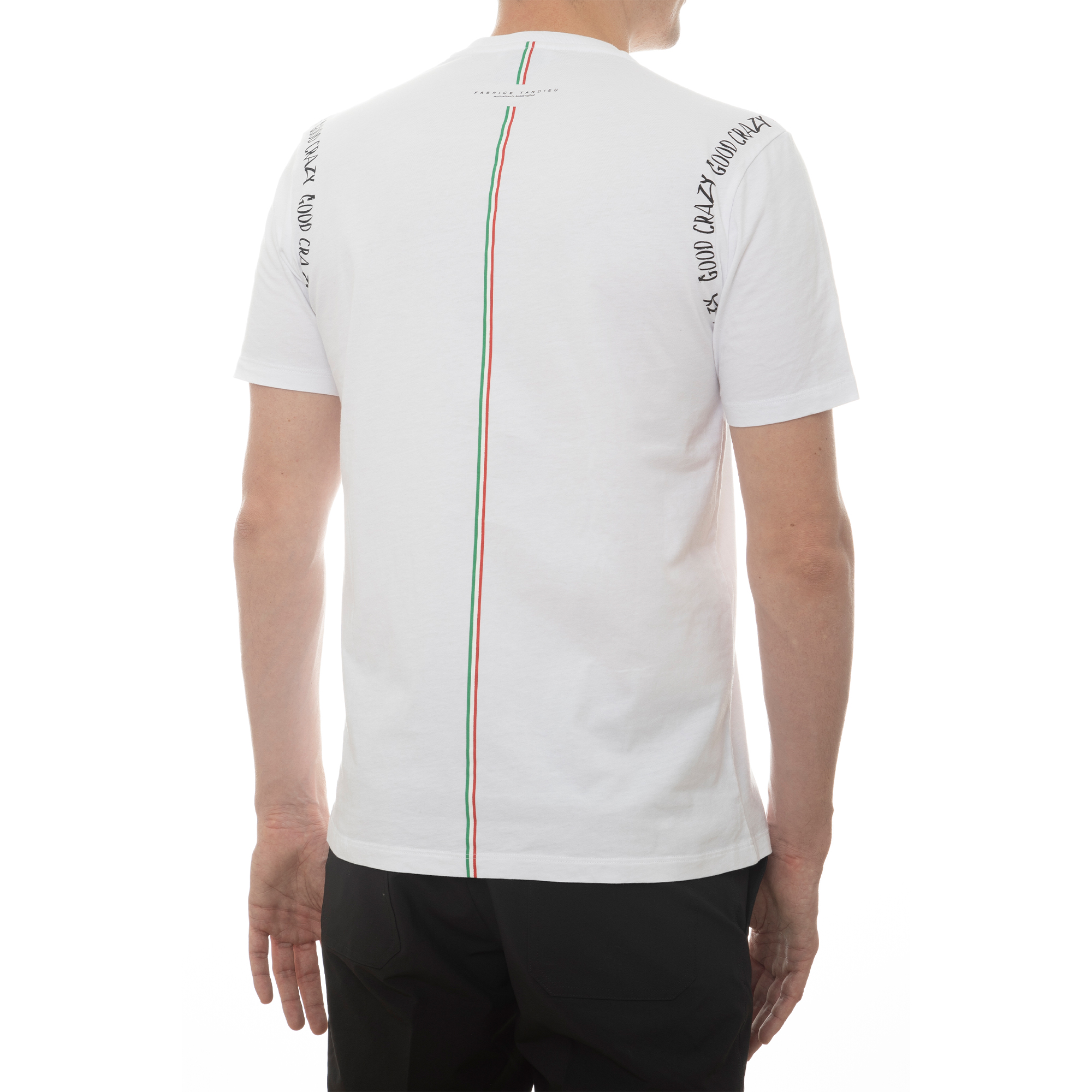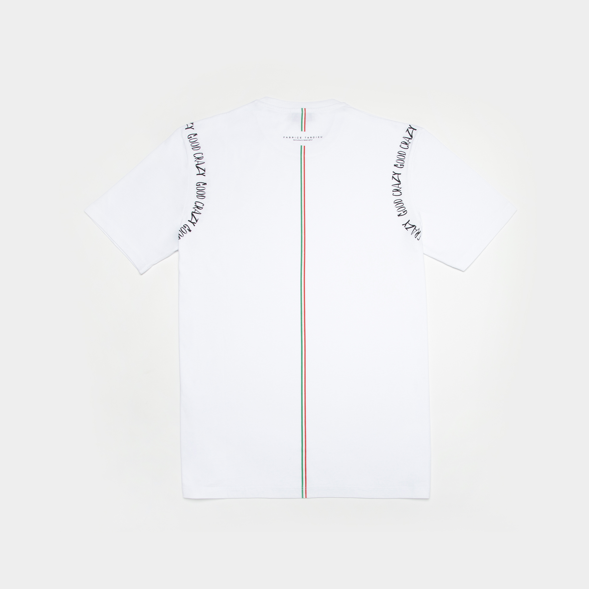 100% high-quality cotton crew neck white t-shirt designed with “GOOD CRAZY” around the full arm sleeve. Printed with Fabrice Tardieu’s signature logo on back and a double green & red line down the center, representing the balance of life.
