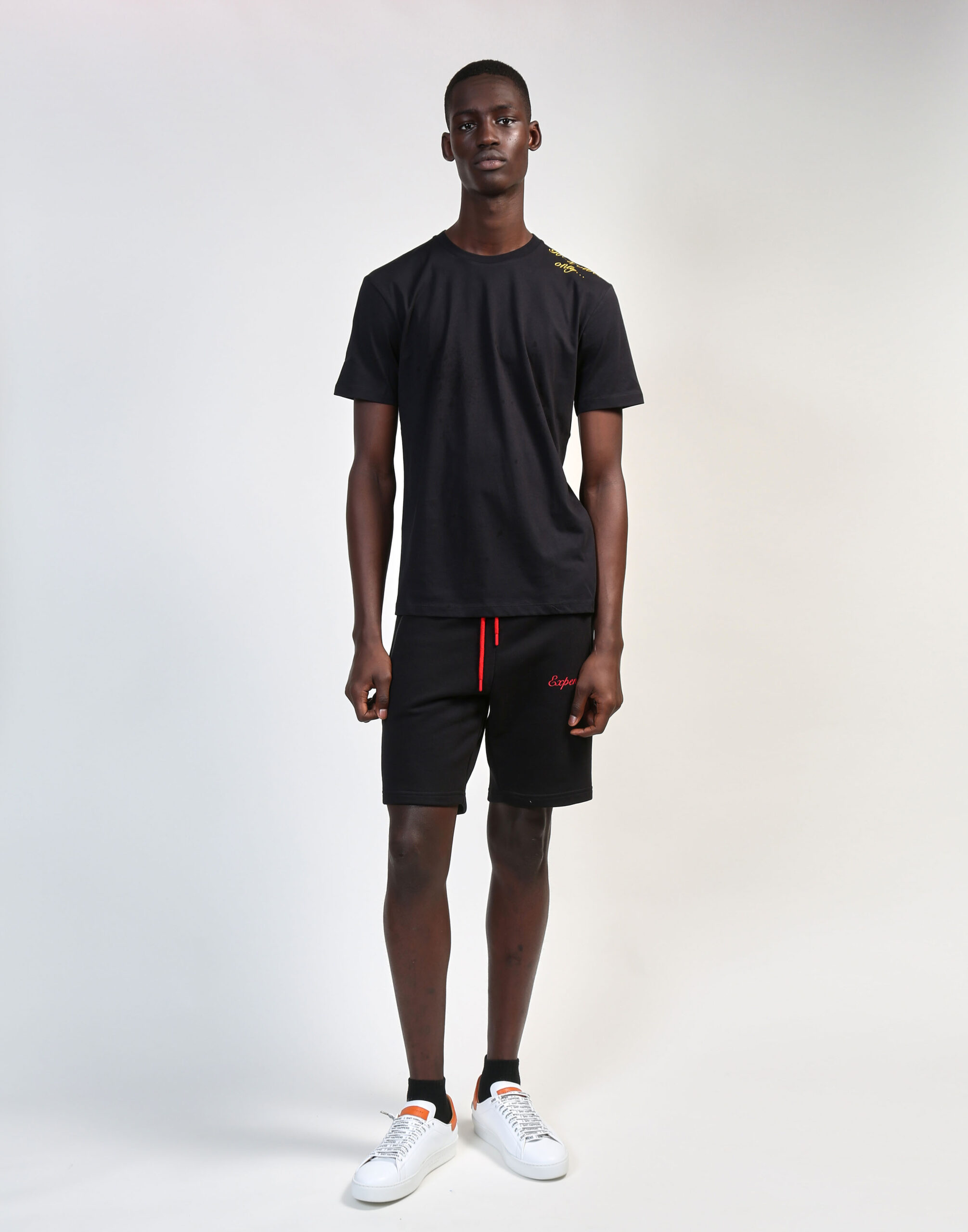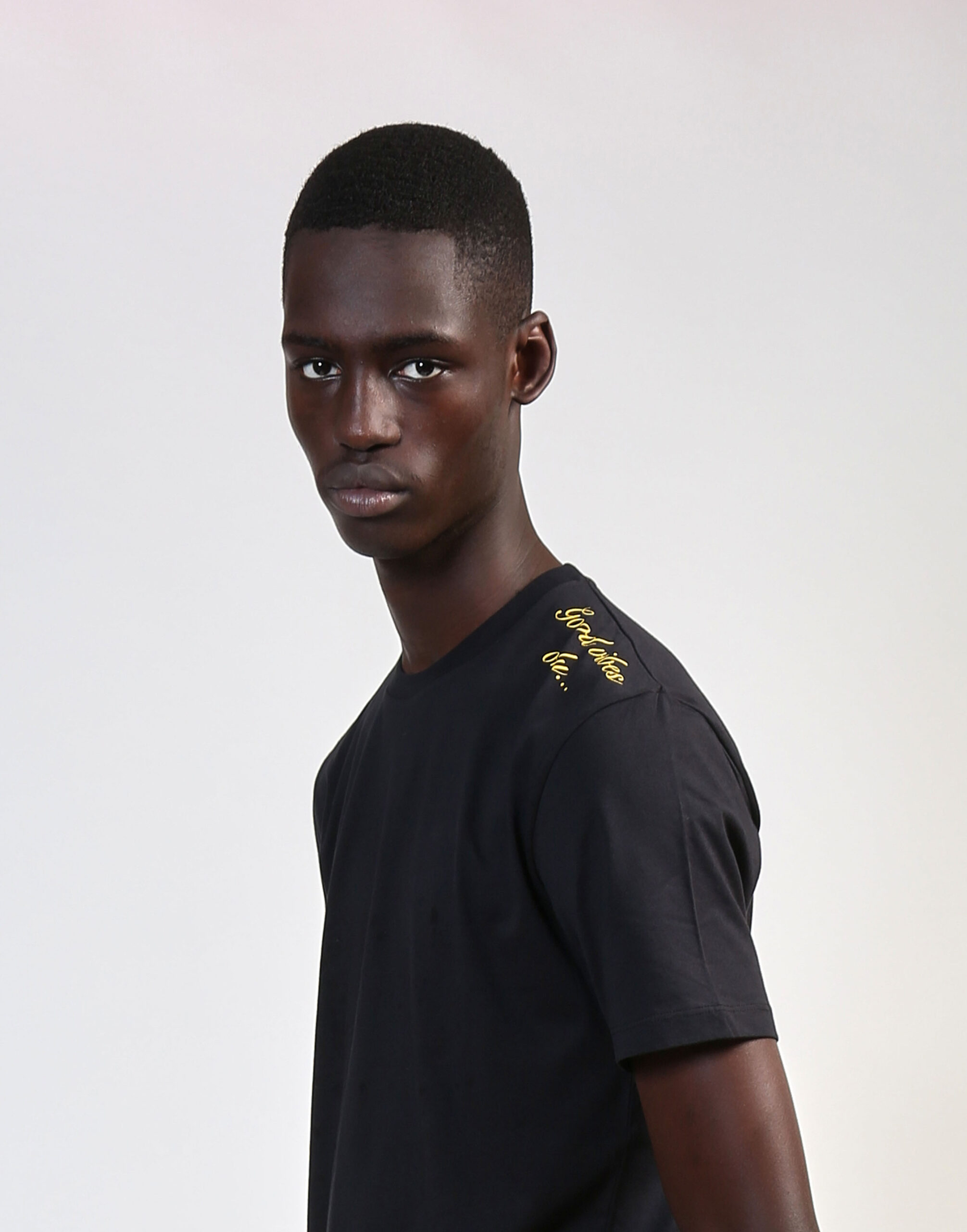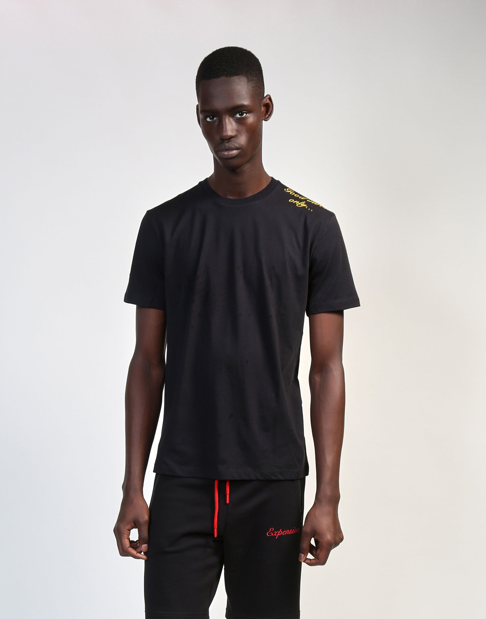 Black short-sleeve crew tee with yellow “Good Vibes Only…” on left shoulder. 100% Cotton. Fabrice Tardieu stripe centered on the back.