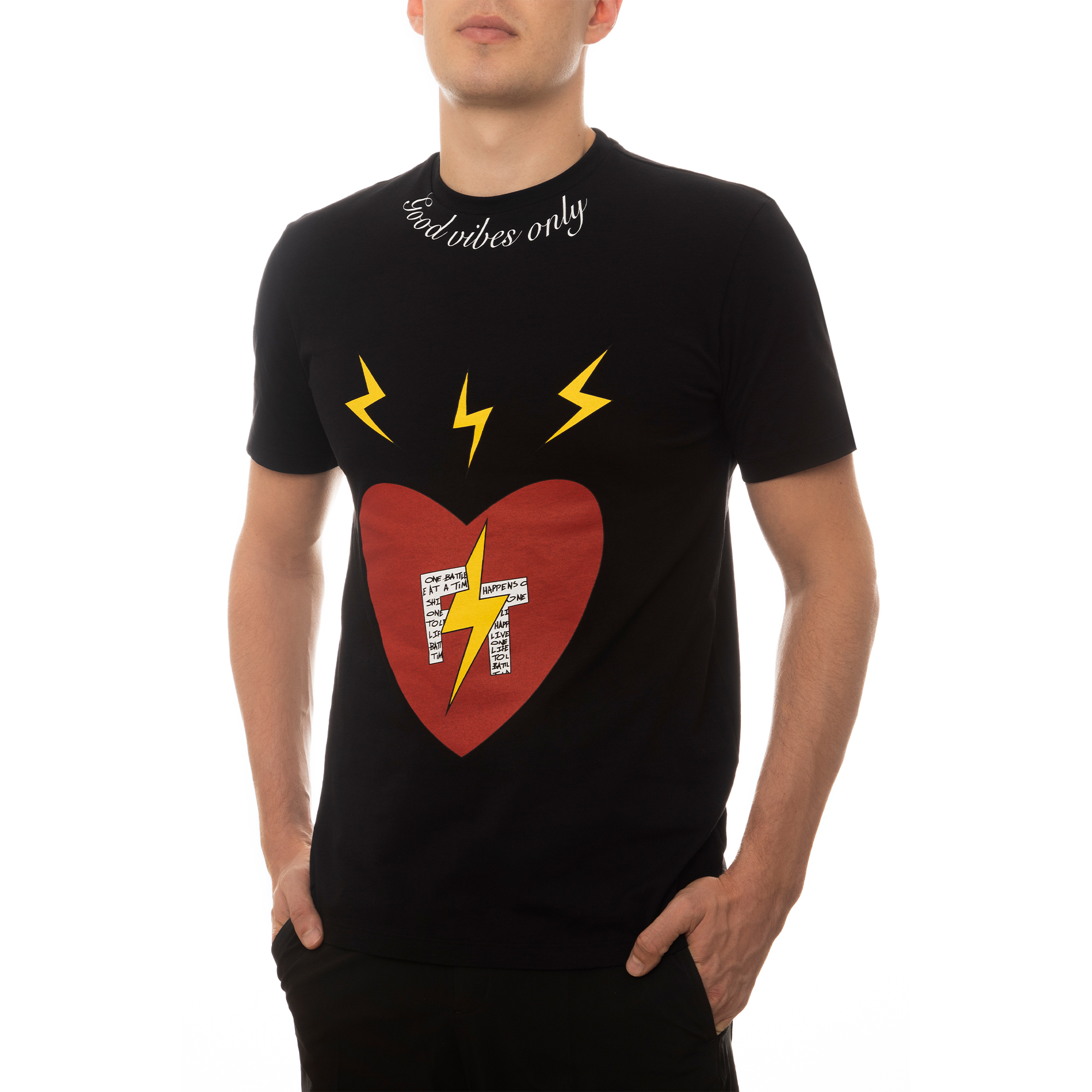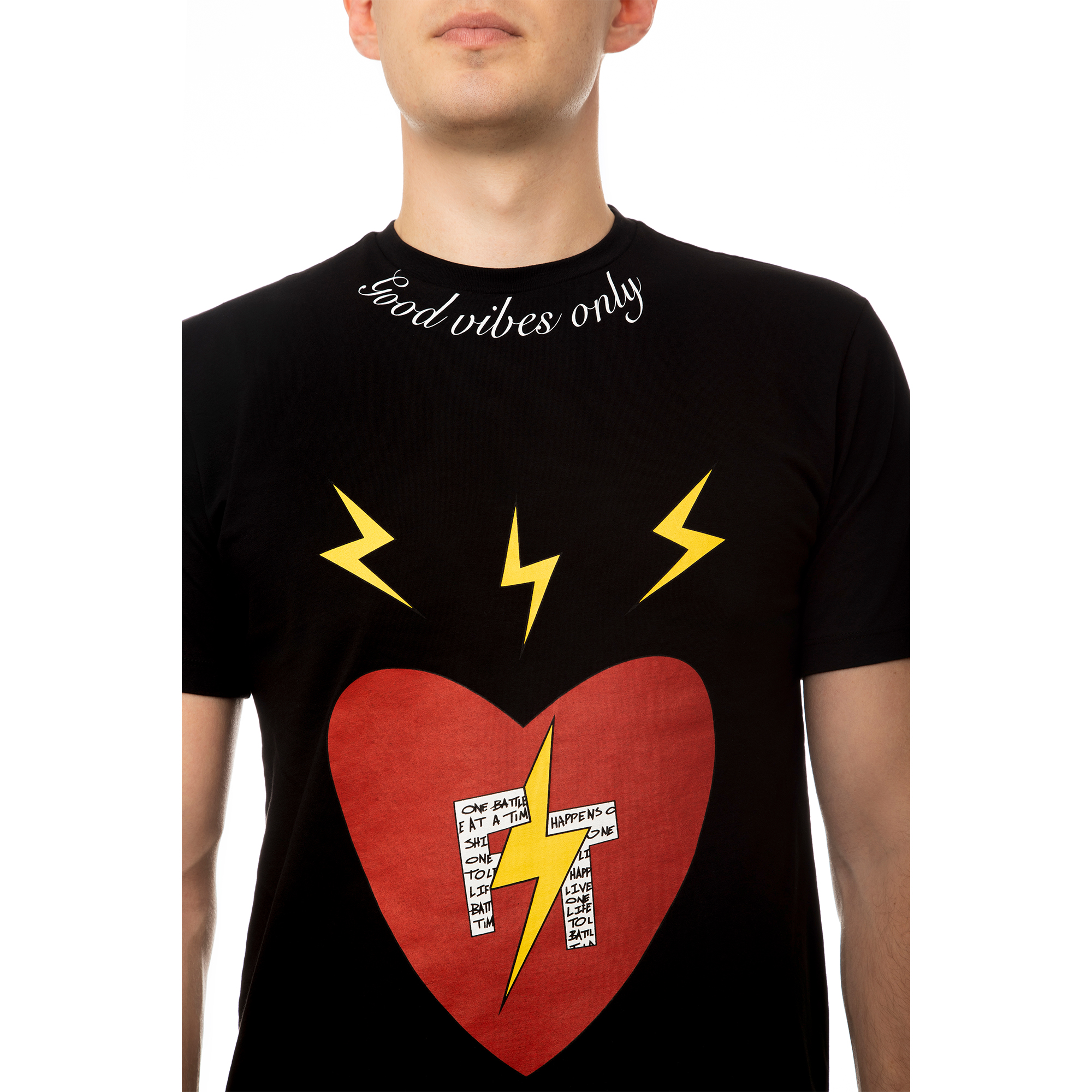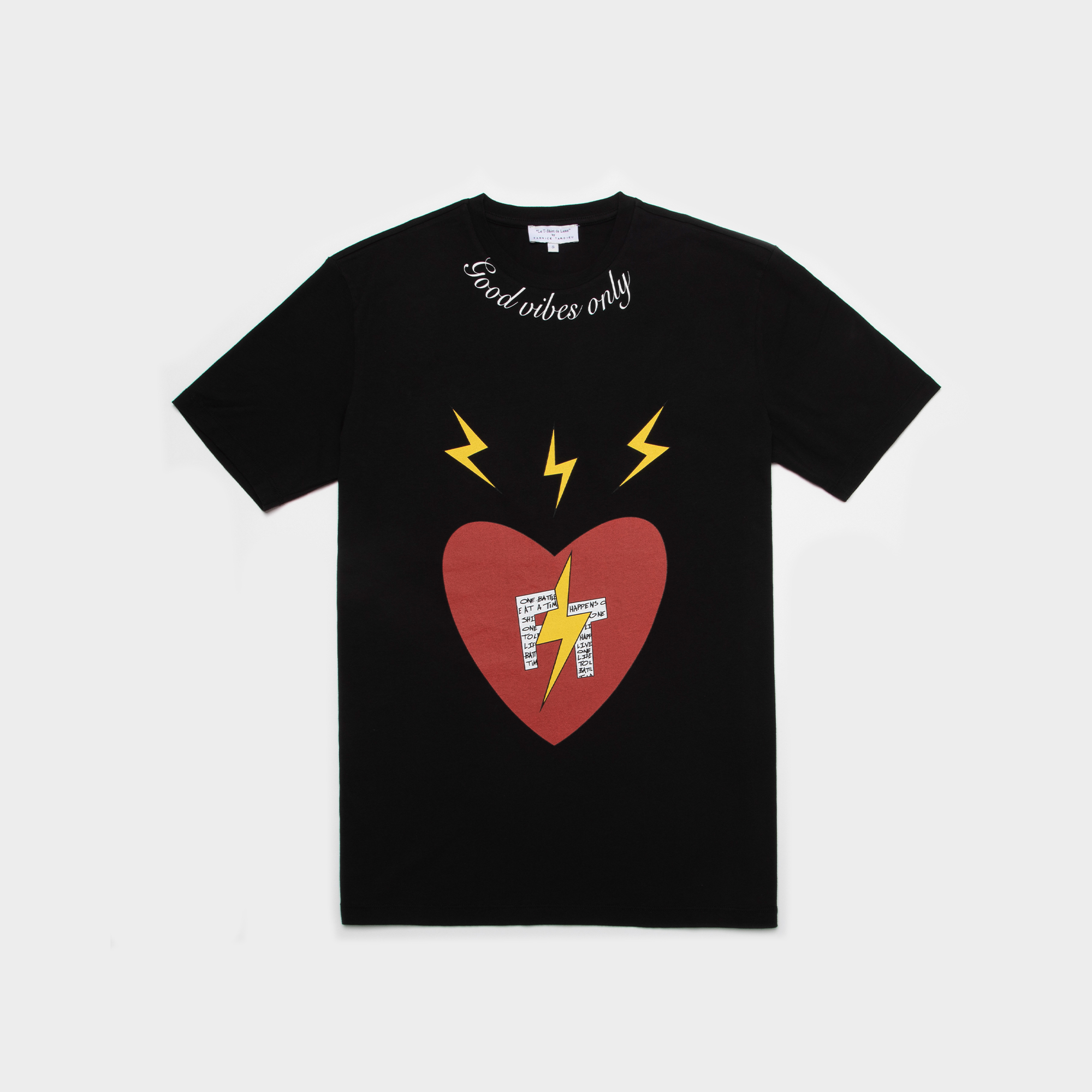 100% high-quality cotton black crew neck t-shirt designed with FT red heart and signature lightning bolts on the front. FT initials encompass Fabrice Tardieu’s motto “One battle at a time” and “One life to live” in small letters. “Good vibes only” printed in white around the front collar. Fabrice Tardieu logo and red, white and yellow stripe down the center of back, representing the balance of life.