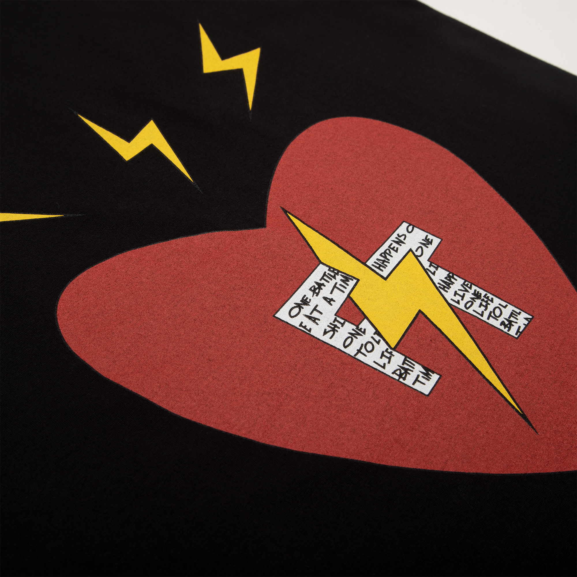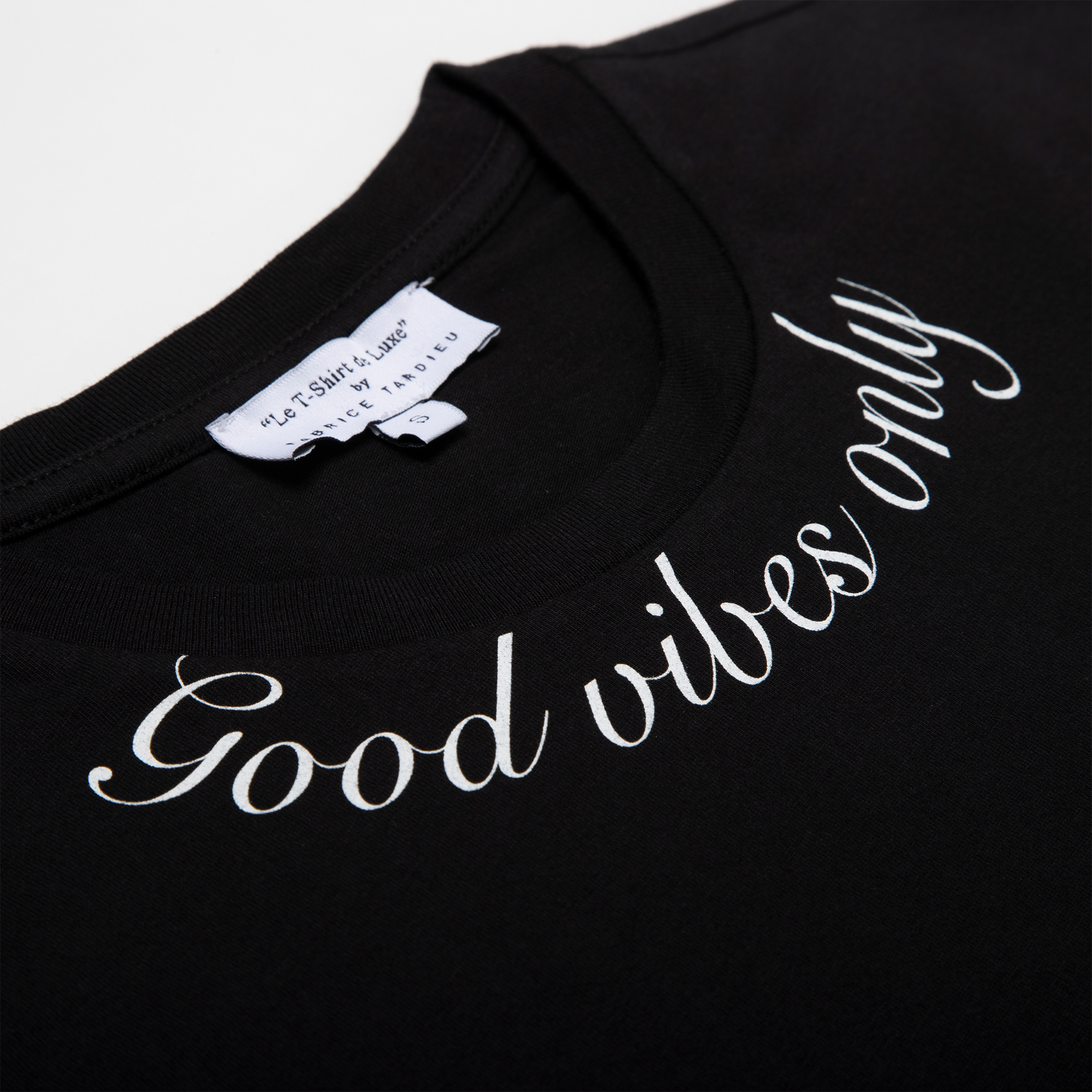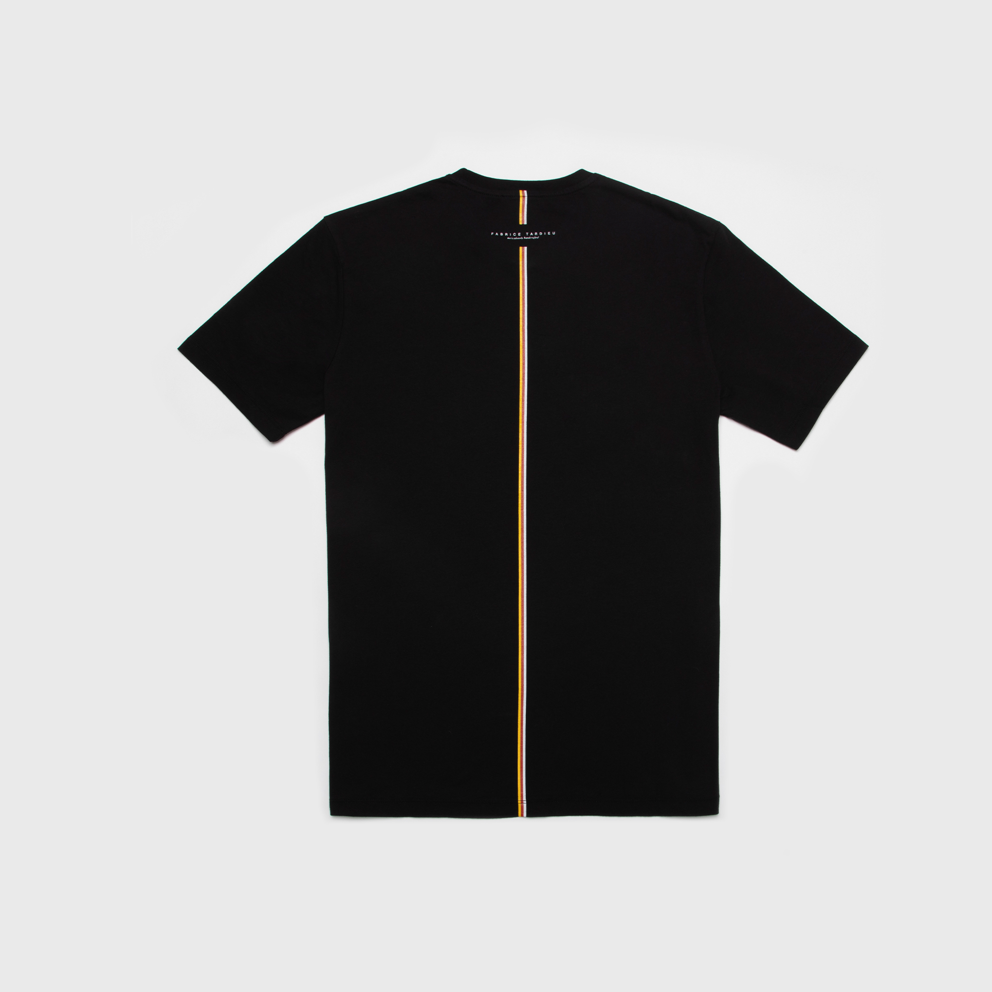 100% high-quality cotton black crew neck t-shirt designed with FT red heart and signature lightning bolts on the front. FT initials encompass Fabrice Tardieu’s motto “One battle at a time” and “One life to live” in small letters. “Good vibes only” printed in white around the front collar. Fabrice Tardieu logo and red, white and yellow stripe down the center of back, representing the balance of life.