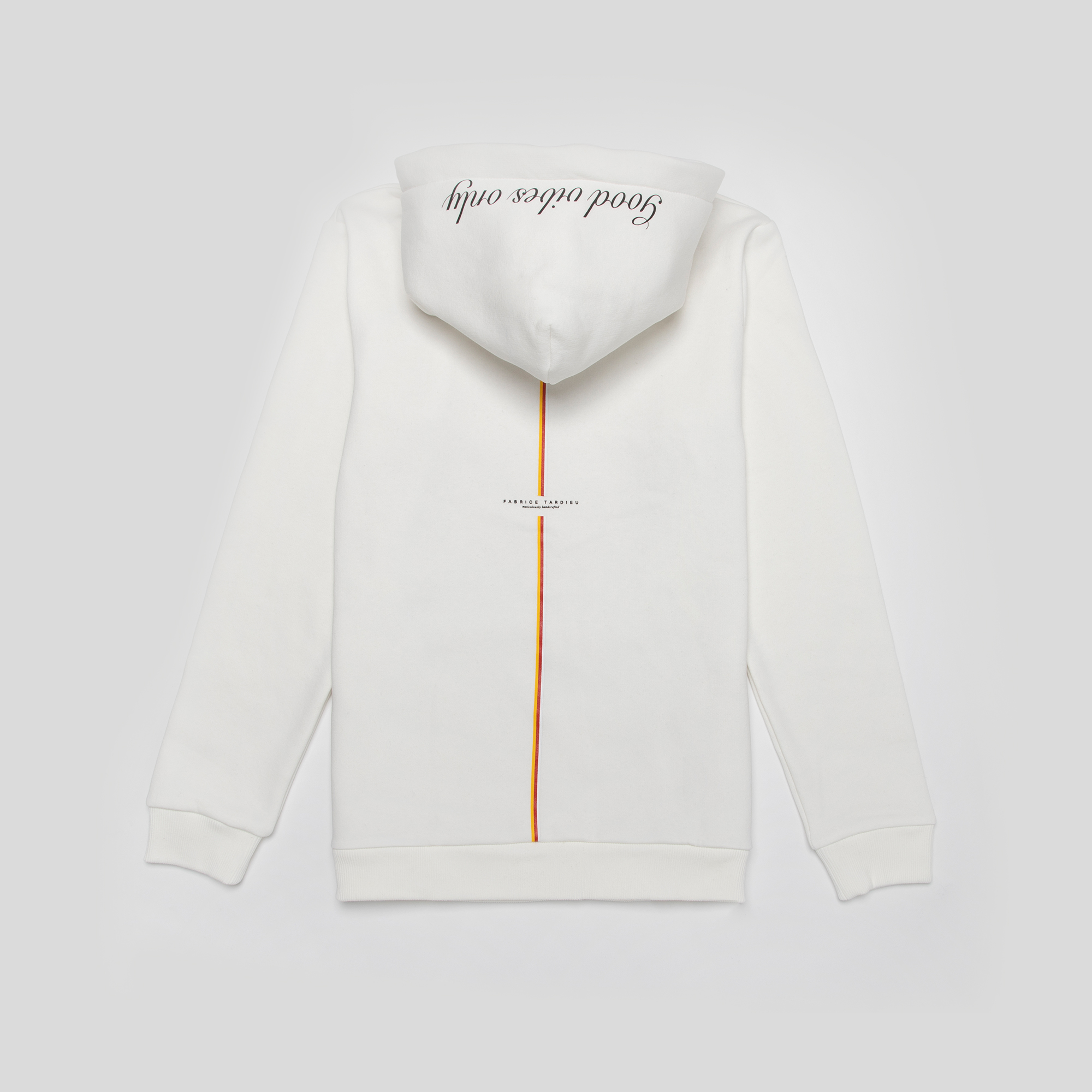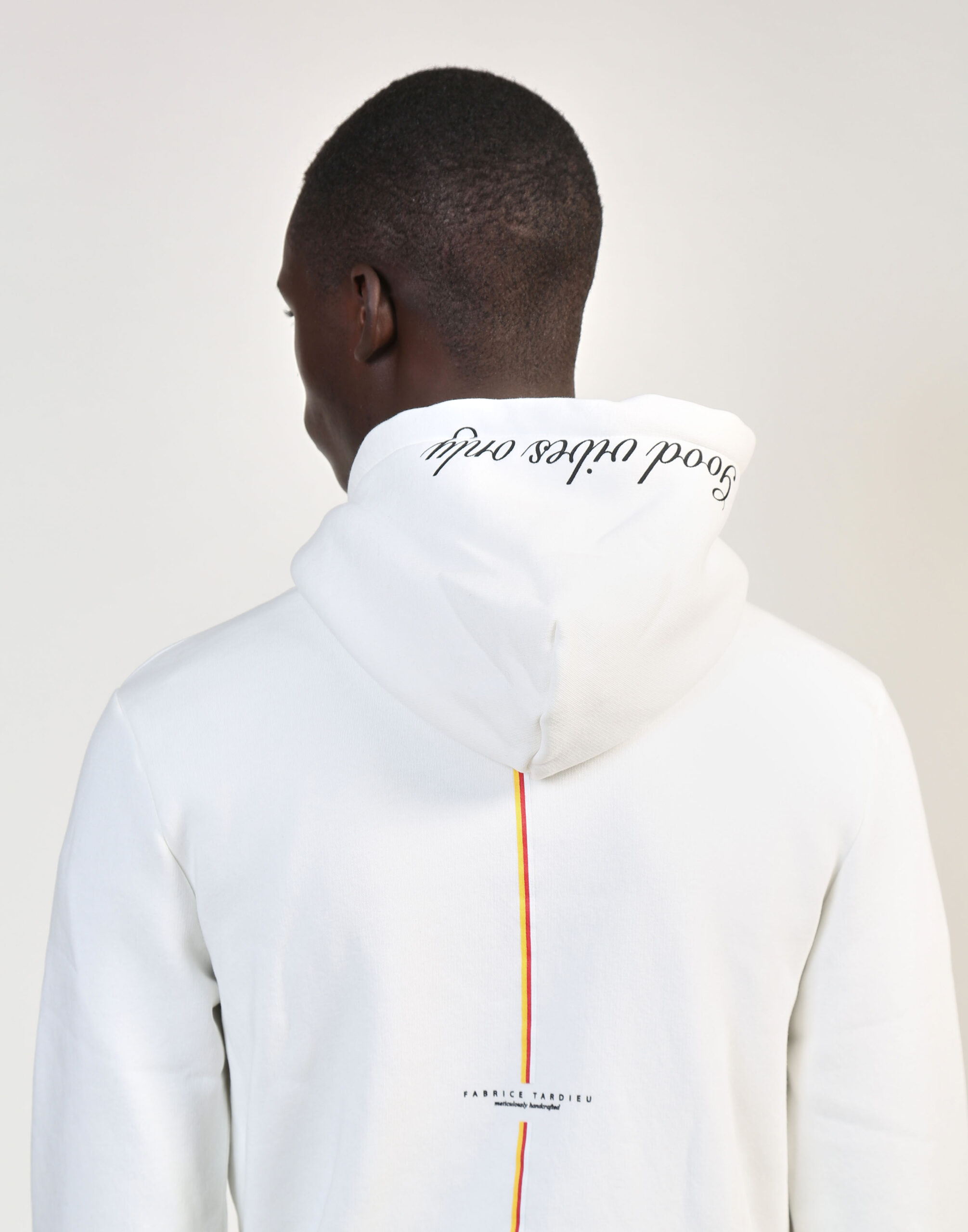 100% high-quality cotton white hoodie designed with FT red heart and signature lightning bolts on the front. FT initials encompass Fabrice Tardieu’s motto “One battle at a time” and “One life to live” in small letters. “Good vibes only” printed in black on the hoodie. Fabrice Tardieu logo and red & yellow stripe down the center of back, representing the balance of life.