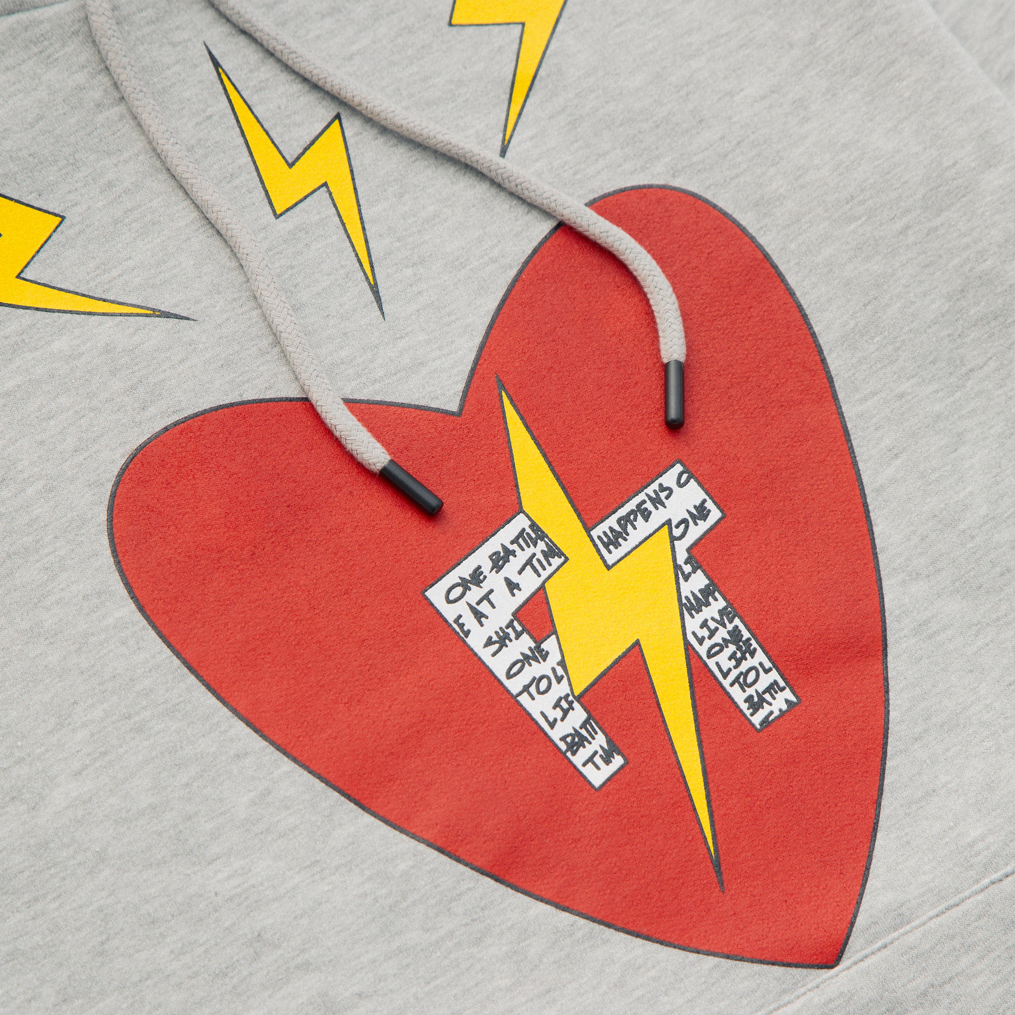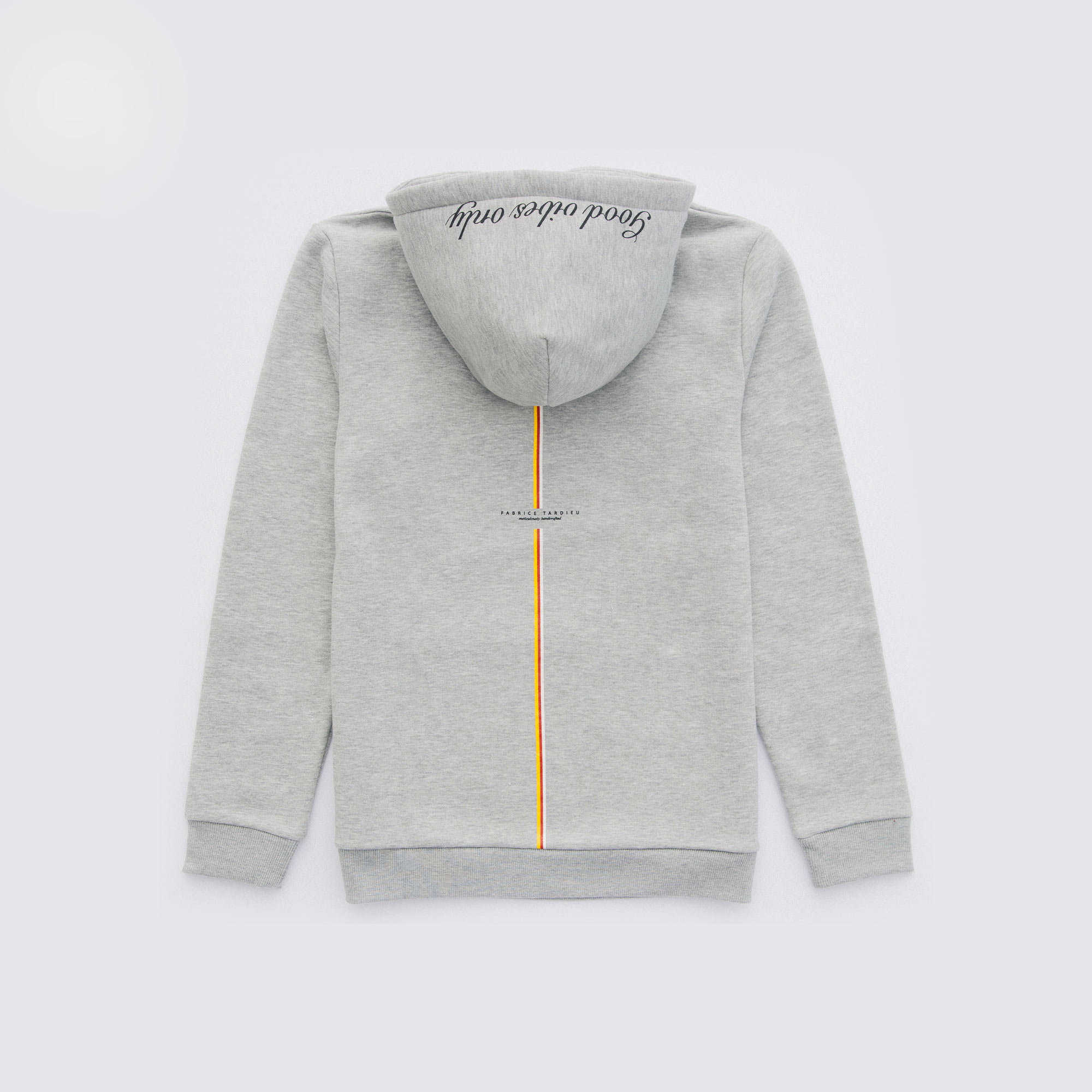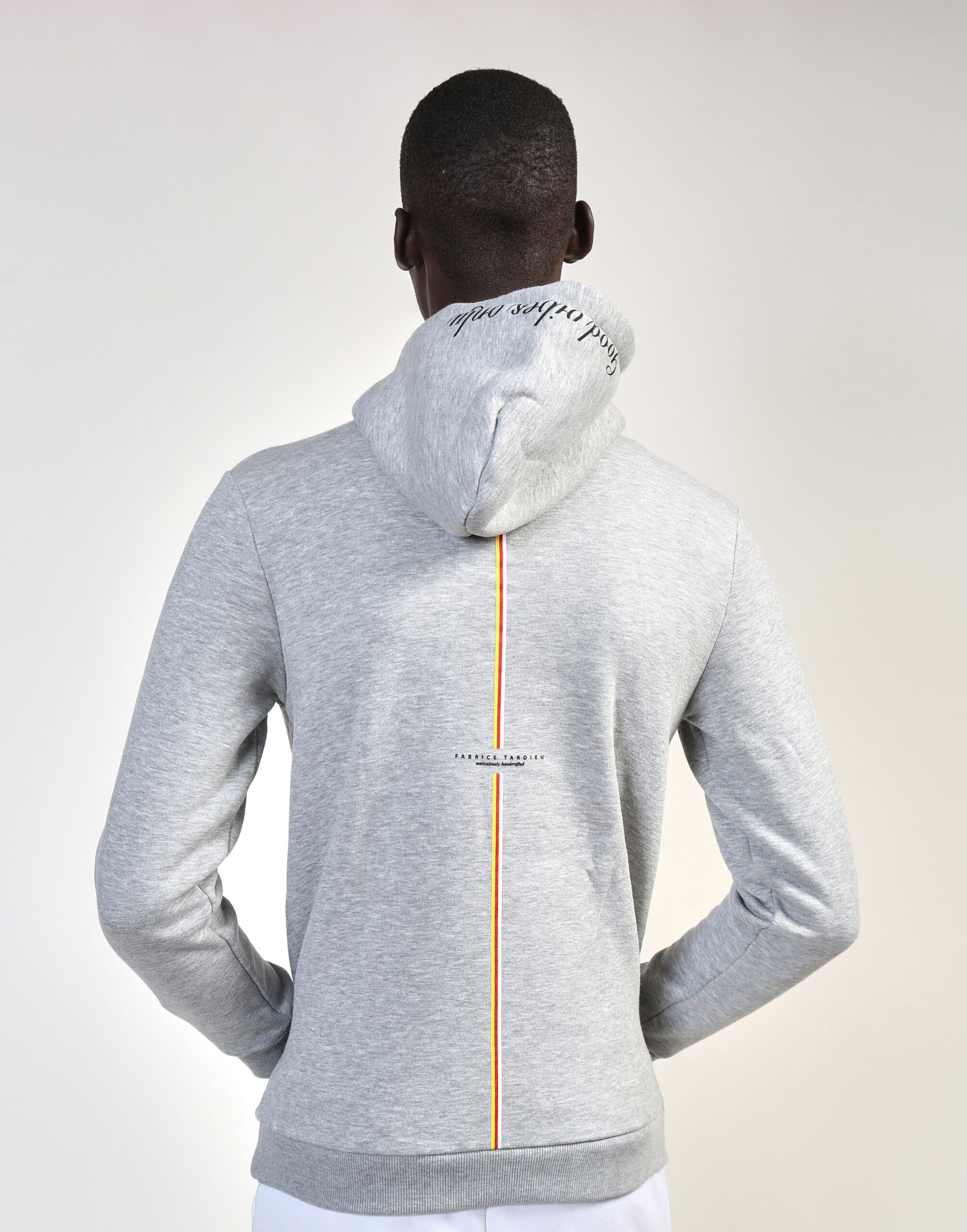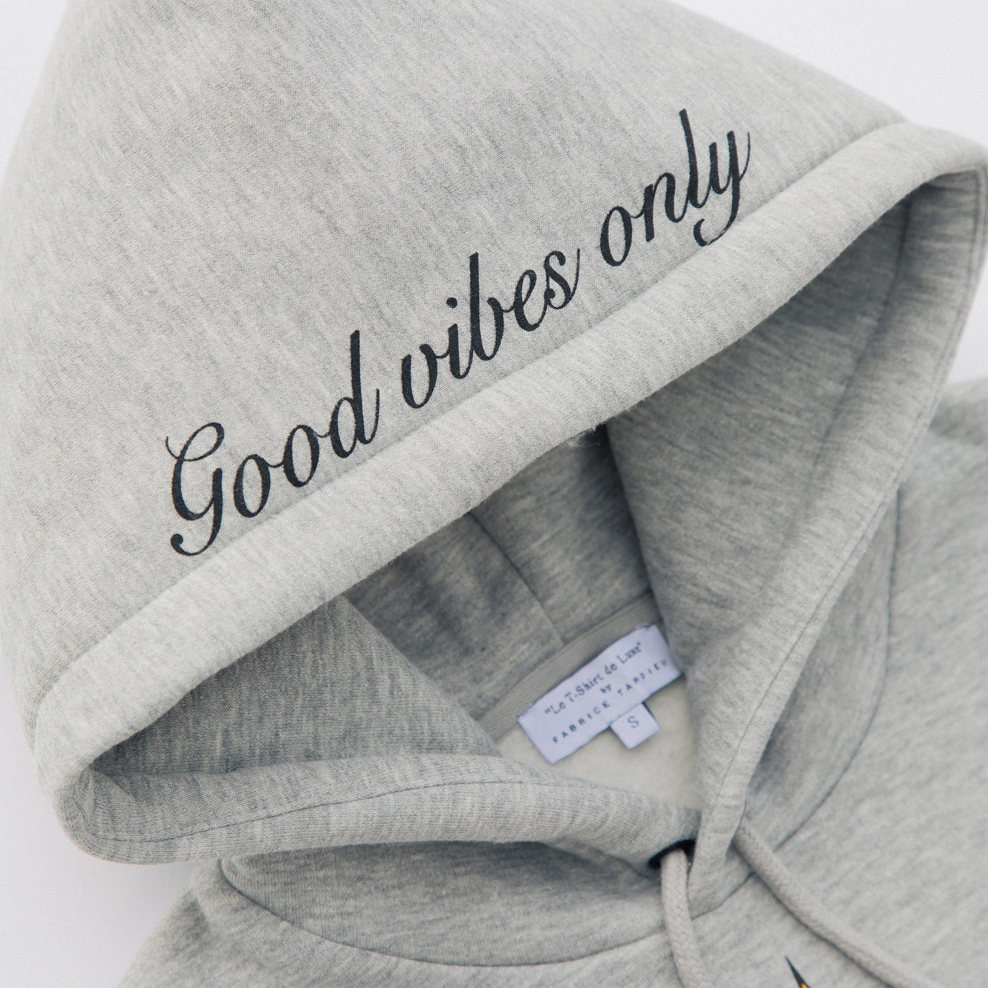 100% high-quality cotton white hoodie designed with FT red heart and signature lightning bolts on the front. FT initials encompass Fabrice Tardieu’s motto “One battle at a time” and “One life to live” in small letters. “Good vibes only” printed in black on the hoodie. Fabrice Tardieu logo and red & yellow stripe down the center of back, representing the balance of life.