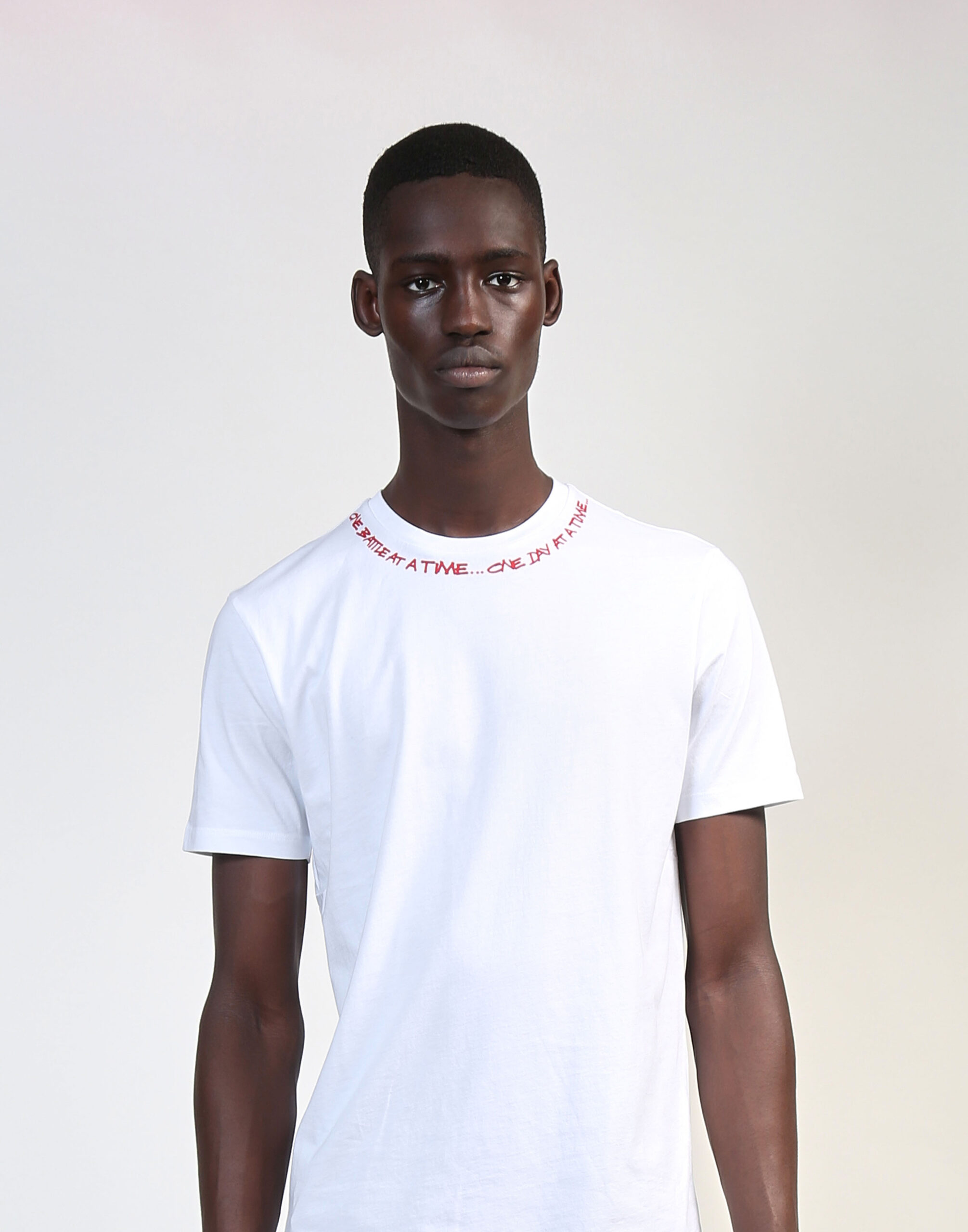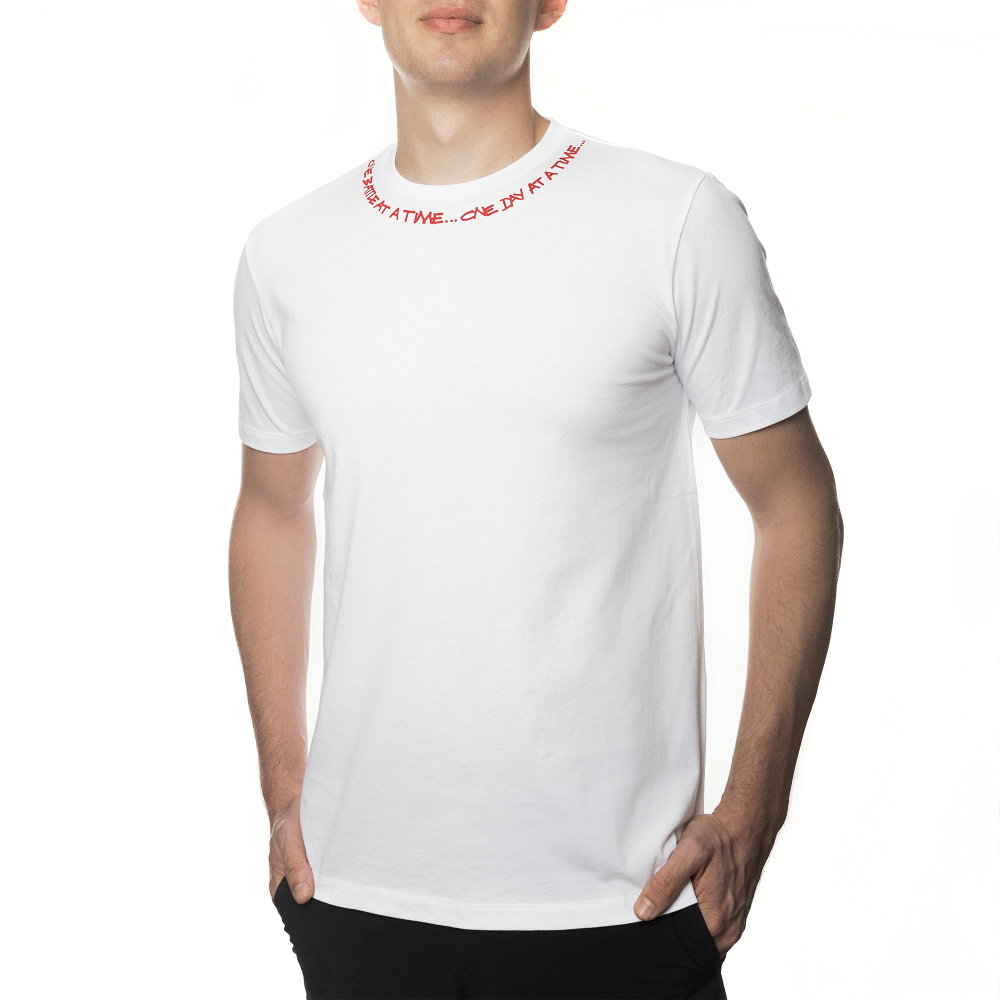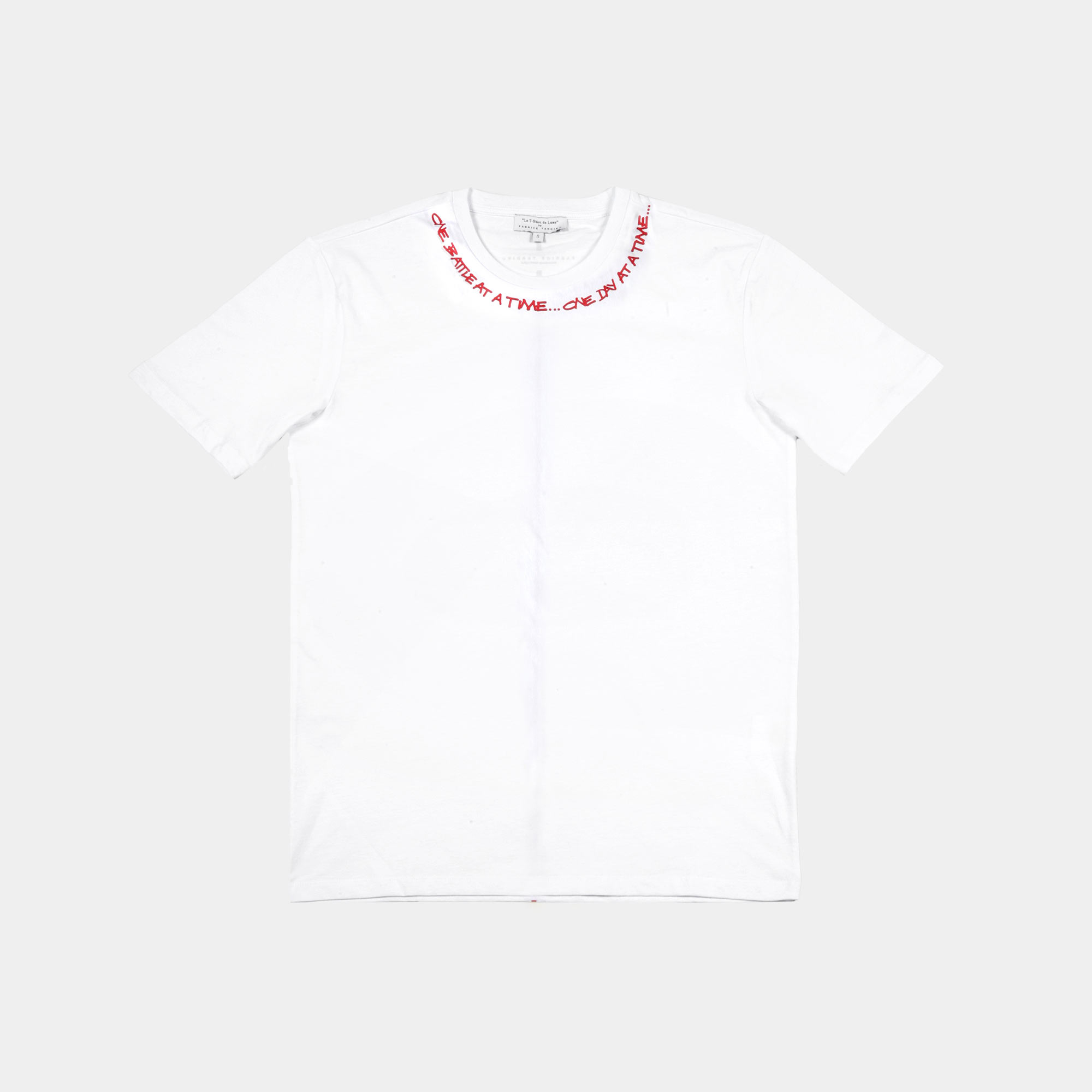 100% high-quality cotton crew neck t-shirt printed with Fabrice Tardieu’s signature motto “One battle at a time…One day at a time” around the full collar.