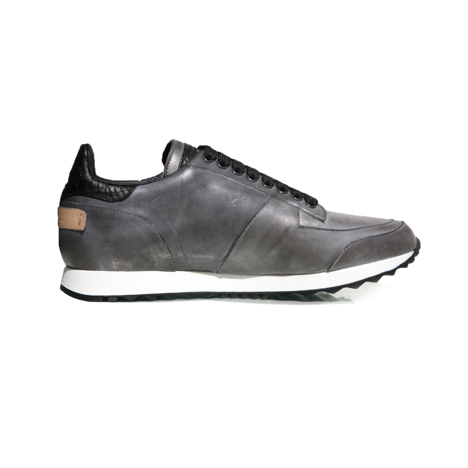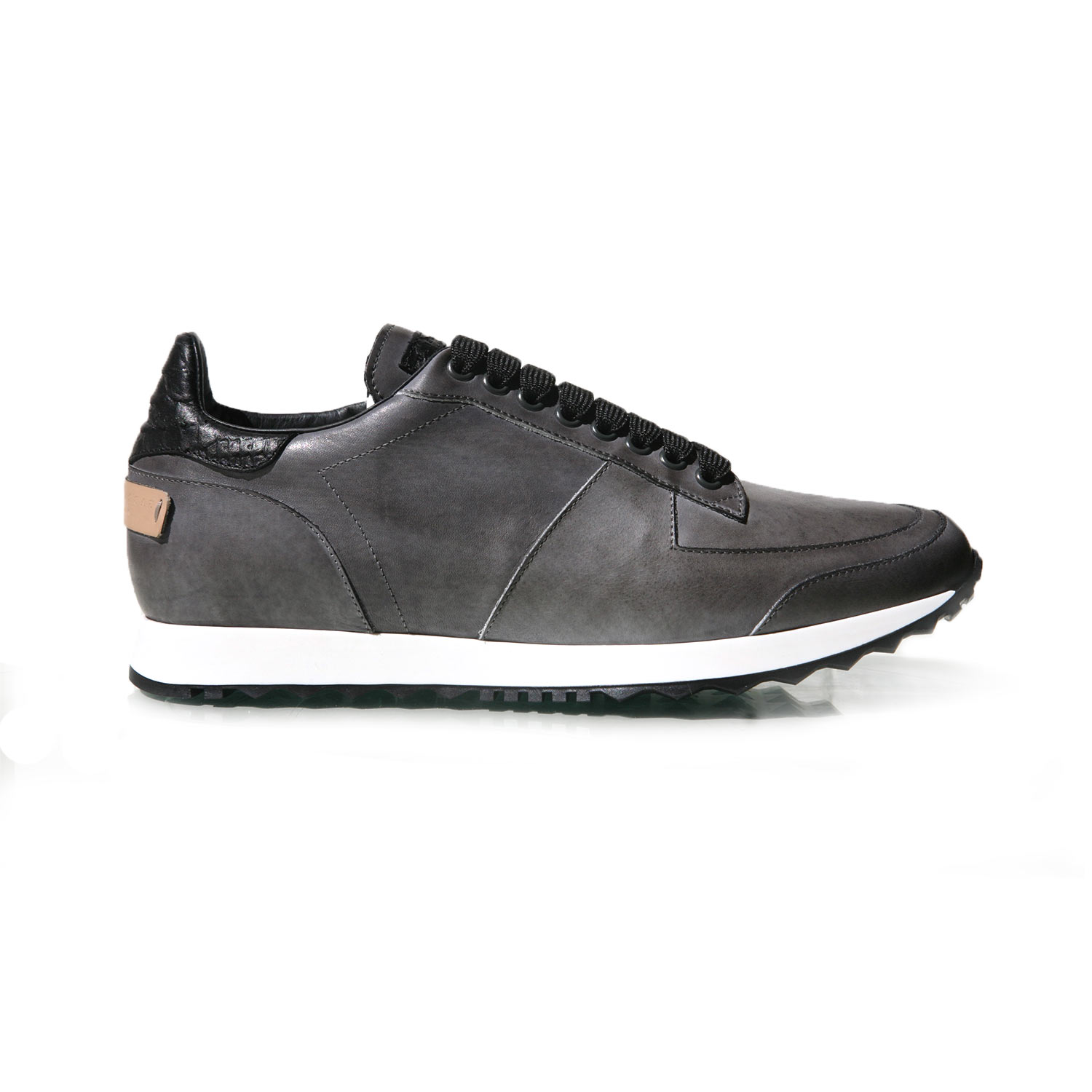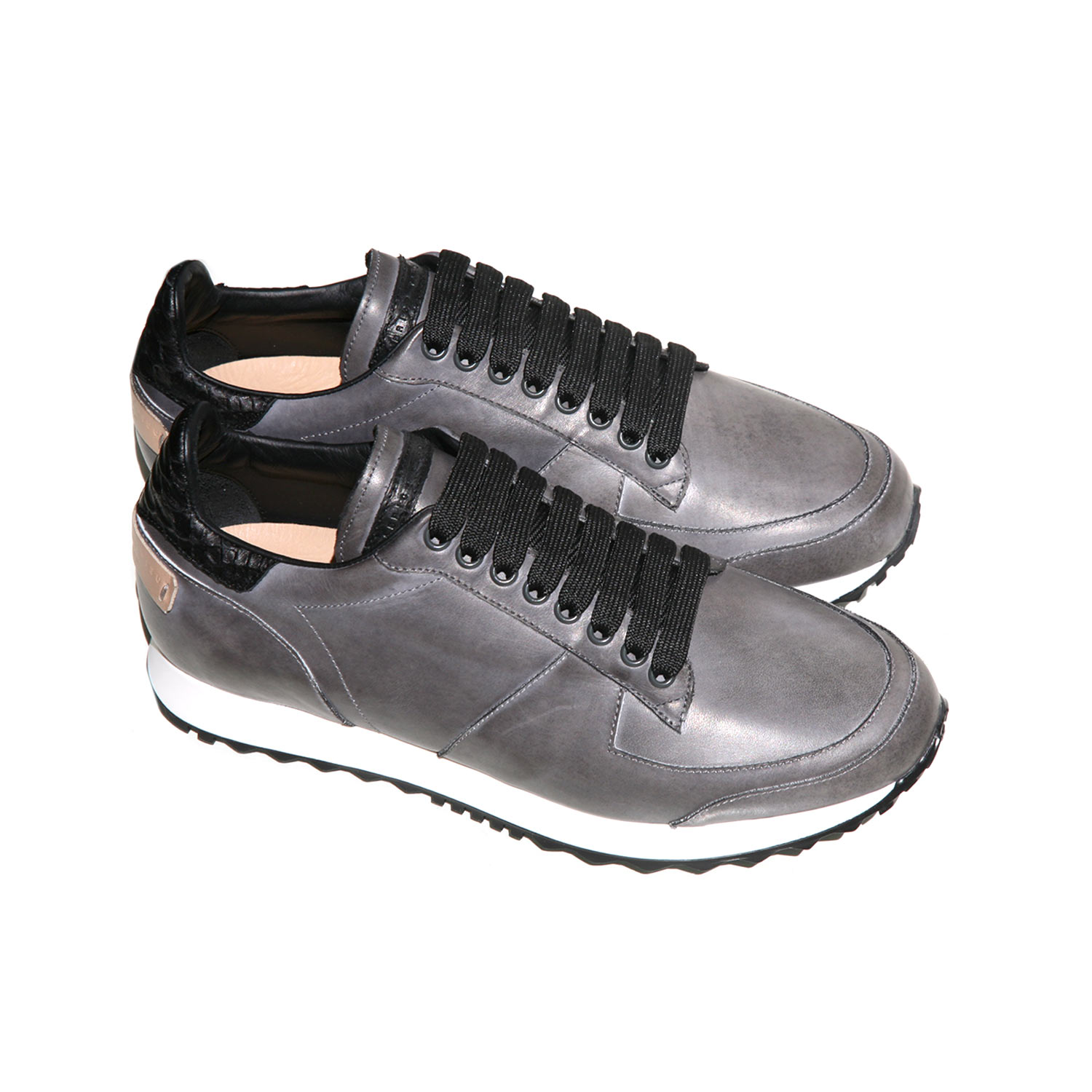 Our Men’s laced-up runner with a high-grip sole is hand-polished in grey to create a patina finish. Black python-inspired details on the heel tab. Ultra padded for comfort and a secure fit, designed with a high-grip bottom texture for effective use on any surface. A stylish and active-wear sneaker.